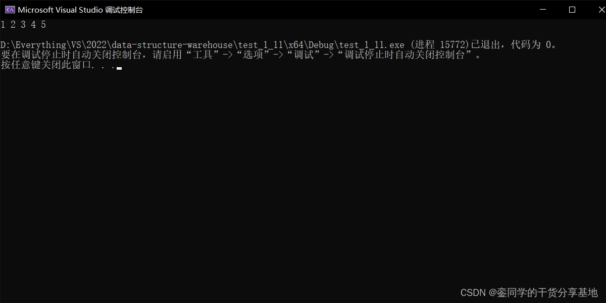 int main() {SeqList S;SeqListInit(&S); //初始化顺序表//顺序表尾插:SeqListPushBack(&S, 1);SeqListPushBack(&S, 2);SeqListPushBack(&S, 3);SeqListPushBack(&S, 4);SeqListPushBack(&S, 5);//打印顺序表:SeqListPrint(&S);//销毁顺序表:SeqListDestory(&S);return 0; }
