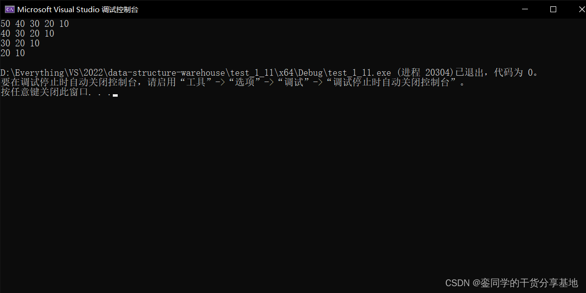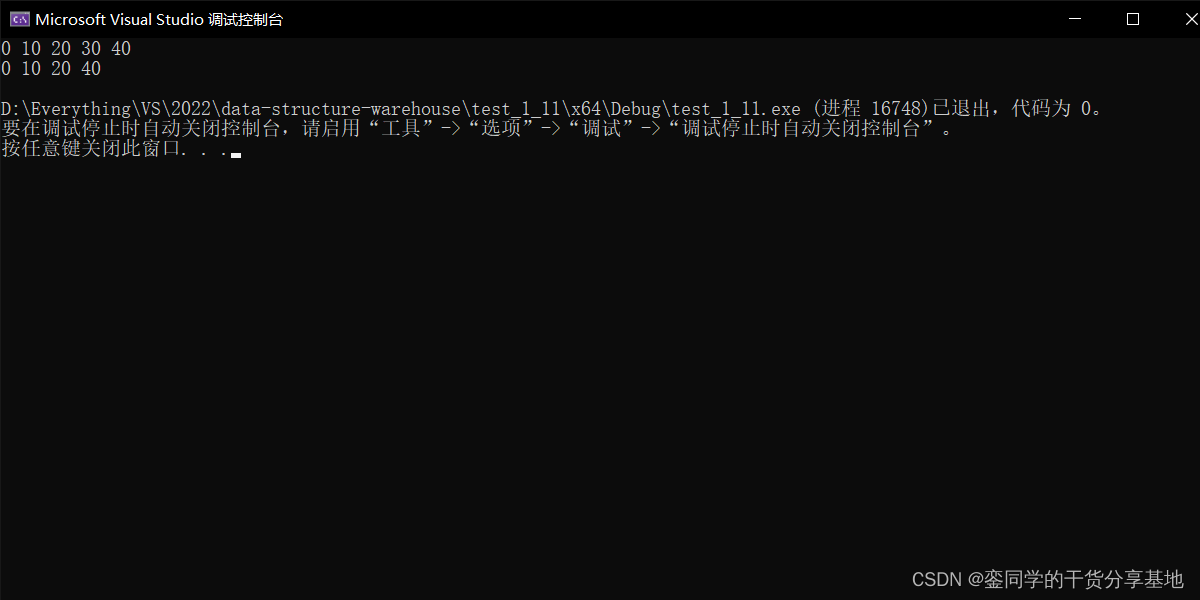 int main() {SeqList S;SeqListInit(&S); //初始化顺序表//尾插:int i = 0;for (i = 0; i < 5; i++){SeqListPushBack(&S, 10 * i);}SeqListPrint(&S); //打印顺序表//删除指定下标位置数据:SeqListErase(&S, 3);SeqListPrint(&S); //打印顺序表SeqListDestory(&S); //销毁顺序表return 0; }