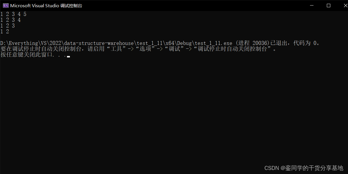 int main() {SeqList S;SeqListInit(&S); //初始化顺序表//顺序表尾插:SeqListPushBack(&S, 1);SeqListPushBack(&S, 2);SeqListPushBack(&S, 3);SeqListPushBack(&S, 4);SeqListPushBack(&S, 5);//打印顺序表:SeqListPrint(&S);//依次尾删:int i = 0;for (i = 0; i < 3; i++){//顺序表尾删:SeqListPopBack(&S);//打印顺序表:SeqListPrint(&S);}//销毁顺序表:SeqListDestory(&S);return 0; }