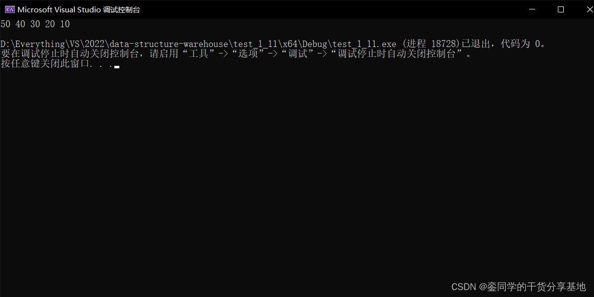 #define _CRT_SECURE_NO_WARNINGS 1#include"SeqList.h"int main() {SeqList S;SeqListInit(&S); //初始化顺序表//尾插:int i = 0;for (i = 0; i < 5; i++){SeqListPushBack(&S, 10 * i);}SeqListPrint(&S); //打印顺序表//修改指定下标处数据:SeqListAt(&S, 3, 100);SeqListPrint(&S); //打印顺序表SeqListDestory(&S); //销毁顺序表return 0; }//查看有效数据个数: //int main() //{ // SeqList S; // SeqListInit(&S); //初始化顺序表 // //尾插: // int i = 0; // for (i = 0; i < 5; i++) // { // SeqListPushBack(&S, 10 * i); // } // SeqListPrint(&S); //打印顺序表 // // //查看有效数据个数: // int ret = SeqListSize(&S); // printf("有效数据个数为:%d\n", ret); // // SeqListDestory(&S); //销毁顺序表 // // return 0; //}//删除指定下标位置数据: //int main() //{ // SeqList S; // SeqListInit(&S); //初始化顺序表 // //尾插: // int i = 0; // for (i = 0; i < 5; i++) // { // SeqListPushBack(&S, 10 * i); // } // SeqListPrint(&S); //打印顺序表 // // //删除指定下标位置数据: // SeqListErase(&S, 3); // SeqListPrint(&S); //打印顺序表 // // SeqListDestory(&S); //销毁顺序表 // // return 0; //}//在指定下标出插入: //int main() //{ // SeqList S; // SeqListInit(&S); //初始化顺序表 // //尾插: // int i = 0; // for (i = 0; i < 5; i++) // { // SeqListPushBack(&S, 10 * i); // } // SeqListPrint(&S); //打印顺序表 // // //在指定位置处插入: // SeqListInsert(&S, 3, 100); // SeqListPrint(&S); //打印顺序表 // SeqListDestory(&S); //销毁顺序表 // // return 0; //}//查找: //int main() //{ // SeqList S; // SeqListInit(&S); //初始化顺序表 // //尾插: // int i = 0; // for (i = 0; i < 5; i++) // { // SeqListPushBack(&S, 10 * i); // } // SeqListPrint(&S); //打印顺序表 // // //查找: // int ret = SeqListFind(&S, 30); // // //验证查找结果: // if (ret == -1) // { // printf("没有找到!\n"); // } // else // { // printf("找到了!\nX = %d\n", S.a[ret]); // } // // SeqListDestory(&S); //销毁顺序表 // // return 0; //}//头插与头删: //int main() //{ // SeqList S; // SeqListInit(&S); //初始化顺序表 // // //顺序表头插: // SeqListPushFront(&S, 10); // SeqListPushFront(&S, 20); // SeqListPushFront(&S, 30); // SeqListPushFront(&S, 40); // SeqListPushFront(&S, 50); // //打印顺序表: // SeqListPrint(&S); // // //顺序表头删: // int i = 0; // for (i = 0; i < 3; i++) // { // SeqListPopFront(&S); // SeqListPrint(&S); // } // //销毁顺序表: // SeqListDestory(&S); // return 0; //}//尾插与尾删: //int main() //{ // SeqList S; // SeqListInit(&S); //初始化顺序表 // // //顺序表尾插: // SeqListPushBack(&S, 1); // SeqListPushBack(&S, 2); // SeqListPushBack(&S, 3); // SeqListPushBack(&S, 4); // SeqListPushBack(&S, 5); // //打印顺序表: // SeqListPrint(&S); // // //依次尾删: // int i = 0; // for (i = 0; i < 3; i++) // { // //顺序表尾删: // SeqListPopBack(&S); // //打印顺序表: // SeqListPrint(&S); // } // //销毁顺序表: // SeqListDestory(&S); // // return 0; //}