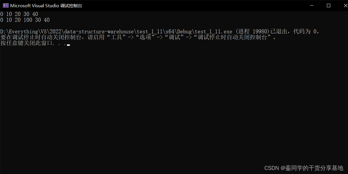 int main() {SeqList S;SeqListInit(&S); //初始化顺序表//尾插:int i = 0;for (i = 0; i < 5; i++){SeqListPushBack(&S, 10 * i);}SeqListPrint(&S); //打印顺序表//在指定位置处插入:SeqListInsert(&S, 3, 100);SeqListPrint(&S); //打印顺序表SeqListDestory(&S); //销毁顺序表return 0; }
