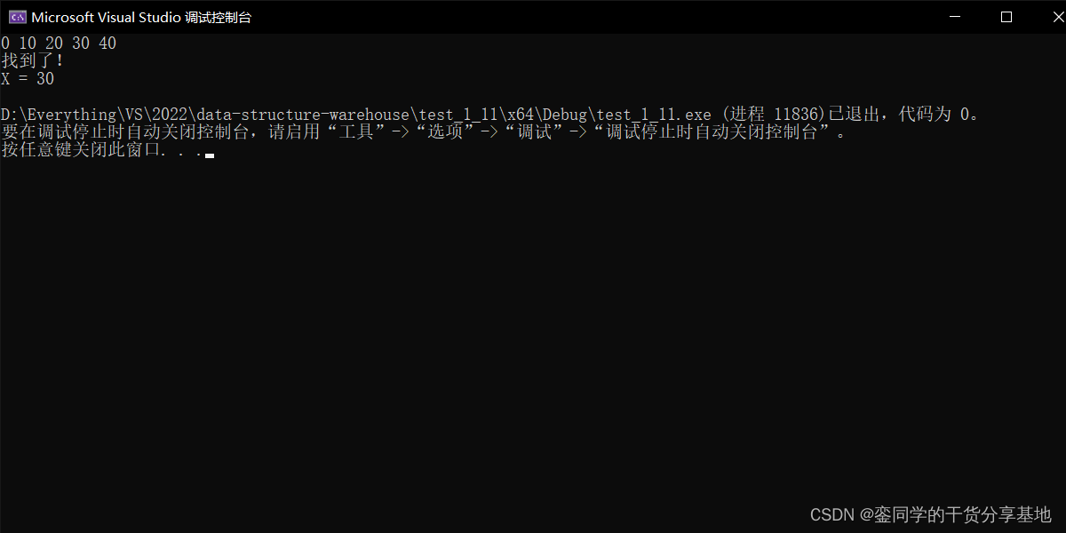 int main() {SeqList S;SeqListInit(&S); //初始化顺序表//尾插:int i = 0;for (i = 0; i < 5; i++){SeqListPushBack(&S, 10 * i);}SeqListPrint(&S); //打印顺序表//查找:int ret = SeqListFind(&S, 30);//验证查找结果:if (ret == -1){printf("没有找到!\n");}else{printf("找到了!\nX = %d\n", S.a[ret]);}SeqListDestory(&S); //销毁顺序表return 0; }
