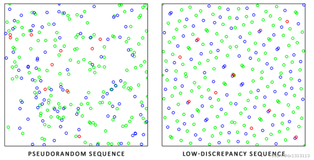 使用伪随机数产生随机采样会造成方向分布不均匀,因为伪随机数之间并不了解彼此的信息,可能会产生丛聚,这会导致蒙特卡罗积分方程式中,预估的准确性较差,收敛速度慢。通过使用低差异序列替换伪随机数,我们可以提高准确度,它本质上可以更好地保证分配的方向。使用Low-Discrepancy Sequence来生成蒙特卡罗采样向量,这个过程被称为Quasi-Monte Carlo积分。Quasi-Monte Carlo方法有更快的收敛速度,使他能够胜任大型复杂的应用。