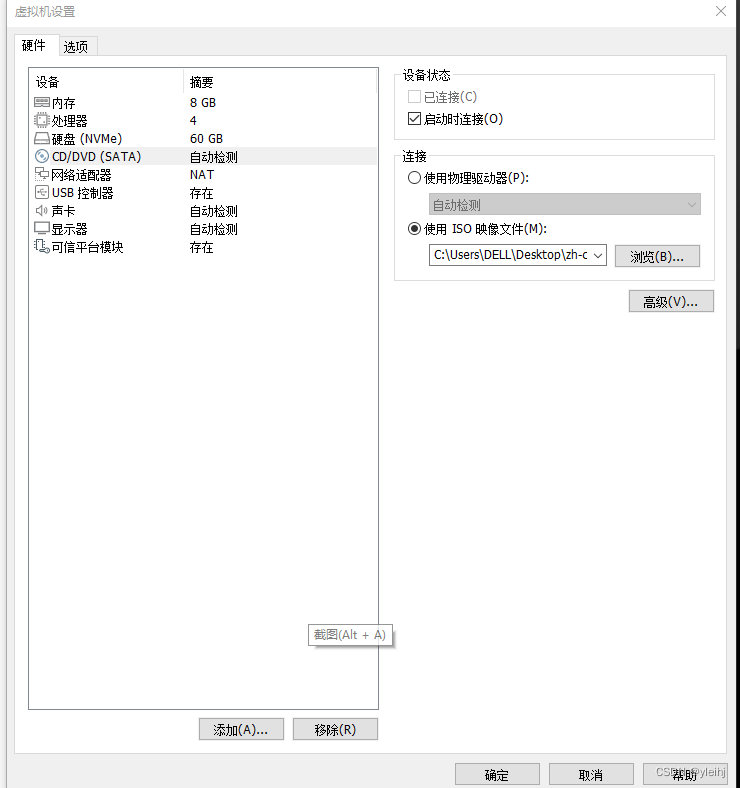 20:在硬件中选择CD/DVD(SATA),在使用ISO映像文件,选择之前准备好的Windows 11镜像,点击确定。