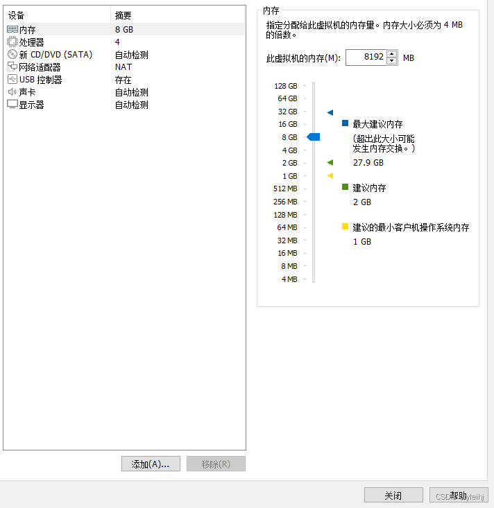 11:根据实际情况和要求选择CPU和内存,可以去掉不需要的硬件比如打印机,点击关闭。