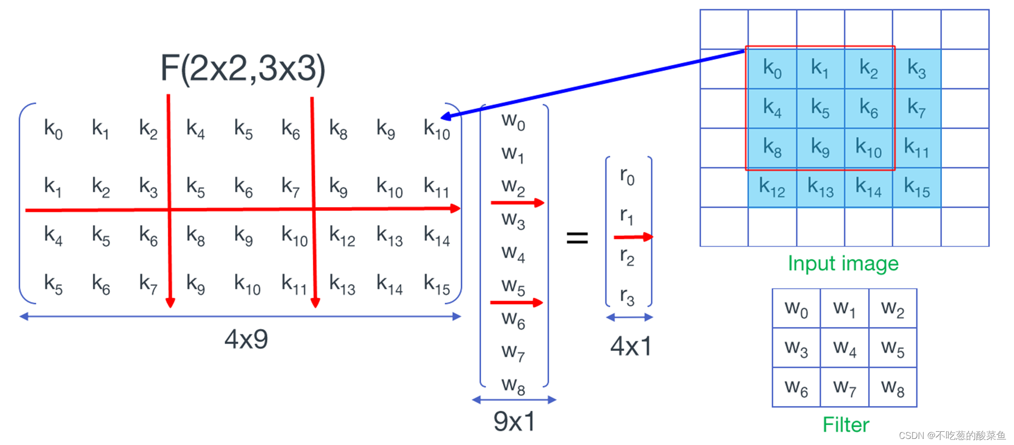 对于二维卷积,如右图所示,用一个3*3的卷积核对4*4的区域进行卷积,总共会卷积四次,我们将3*3的卷积核拉长成一个9*1的矩阵,4*4的区域按照和卷积核的乘法方式,扩展为一个4*9的矩阵,这样这个4*9的区域扩展矩阵和9*1的卷积核扩展矩阵的乘积还是等于卷积结果: