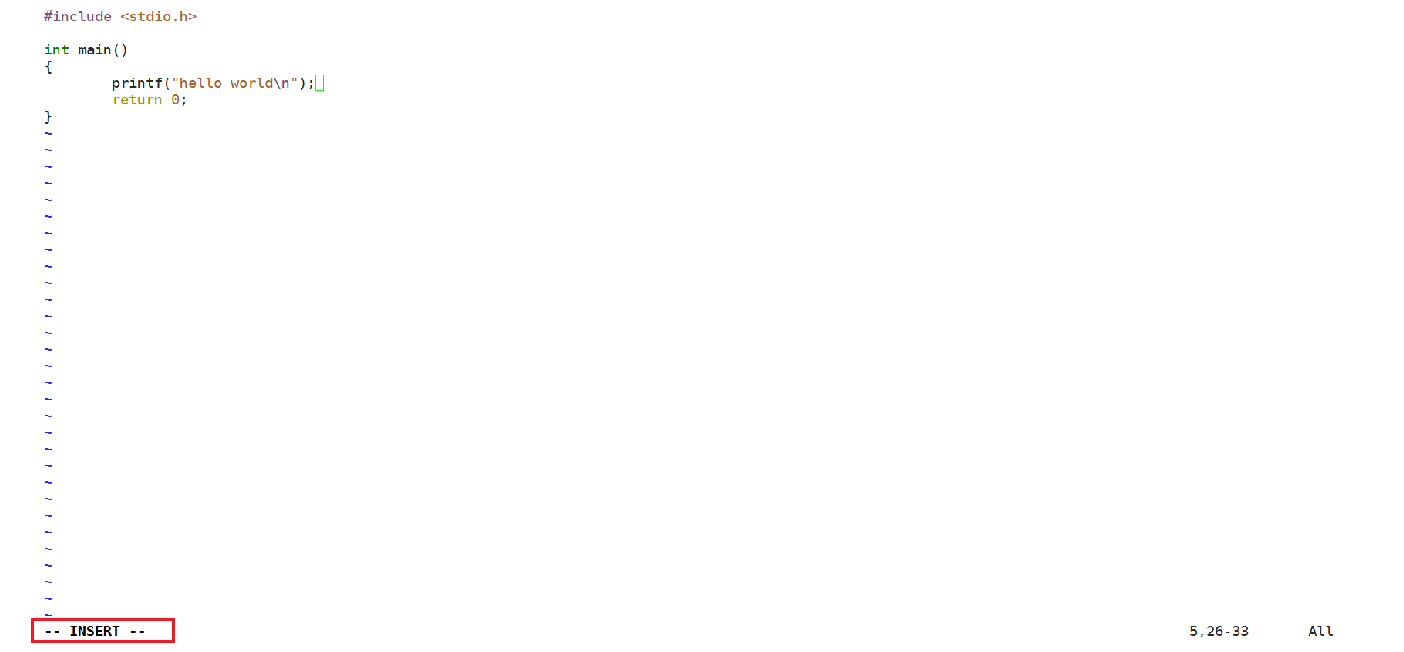 我们进入到 vim 编辑器,默认为 命令模式,可以发现我们在键盘上敲击字符,编辑器不会产生任何变化,这是因为只有在 插入模式 下,才可以做文字输入。在 命令模式 下键入字符 i ,可以切换到 插入模式。此时我们就可以进行文本编辑。