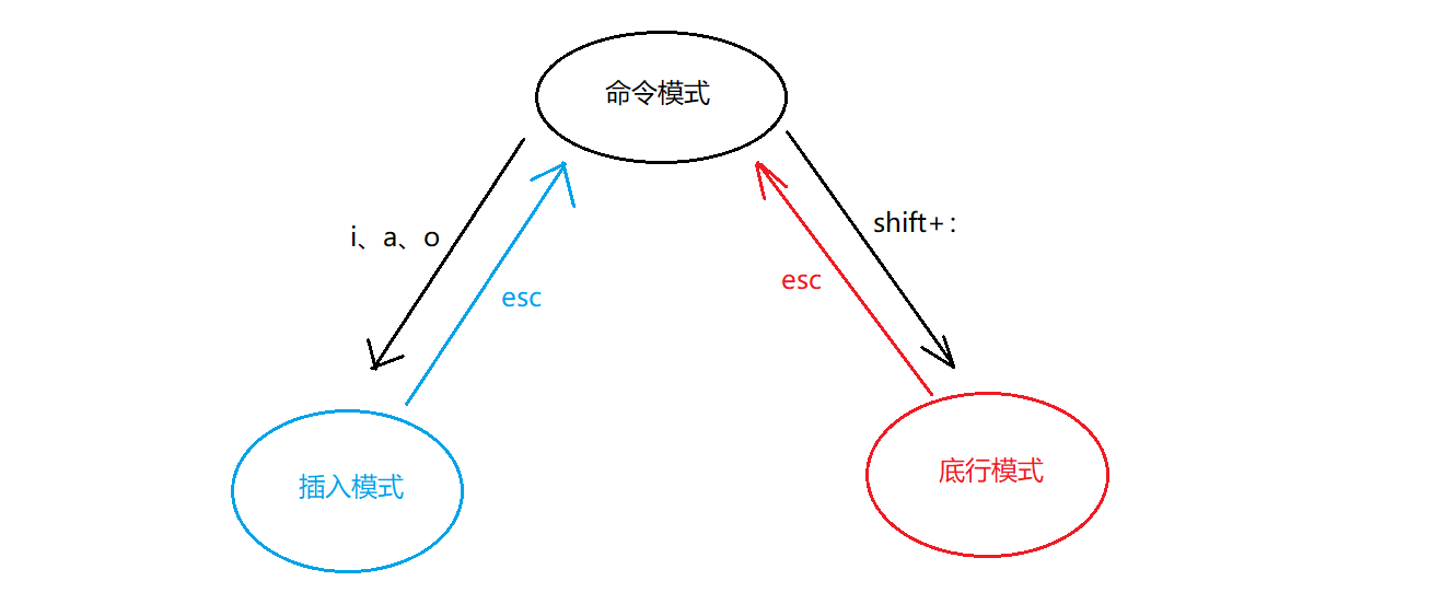 vim 的模式有很多种,其中最常用的三种模式,分别为命令模式(command mode)、插入模式(Insert mode)和底行模式(last line mode):