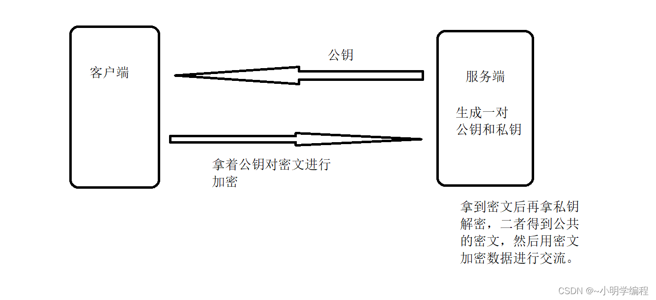 非对称加密中我们会引入公钥和私钥,我们的服务器生成一对公钥和私钥,其中我们把公钥发给我们的客户端,用于加密,然后我们再用我们的私钥对返回的数据进行解密。