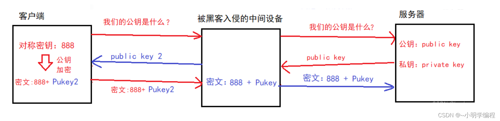 简单的描述一下这个过程就是上述,这时就算黑客截取到了中间的密文,因为没有密钥也是没有什么用的。