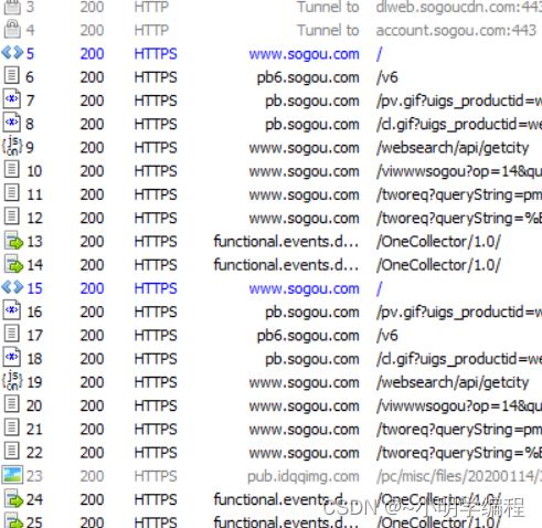 当我们打开我们的浏览器进入到搜狗的官网,然后就发现我们这边抓取到了很多的信息,其中大部分是HTTPS协议的(HTTPS相比HTTP的主要区别是HTTPS就信息进行了加密使得我们的信息在传输的时候不容易被更改)