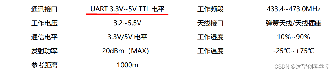 无线通信模块参数,使用的是5V供电,3.3VTTL通信电平: