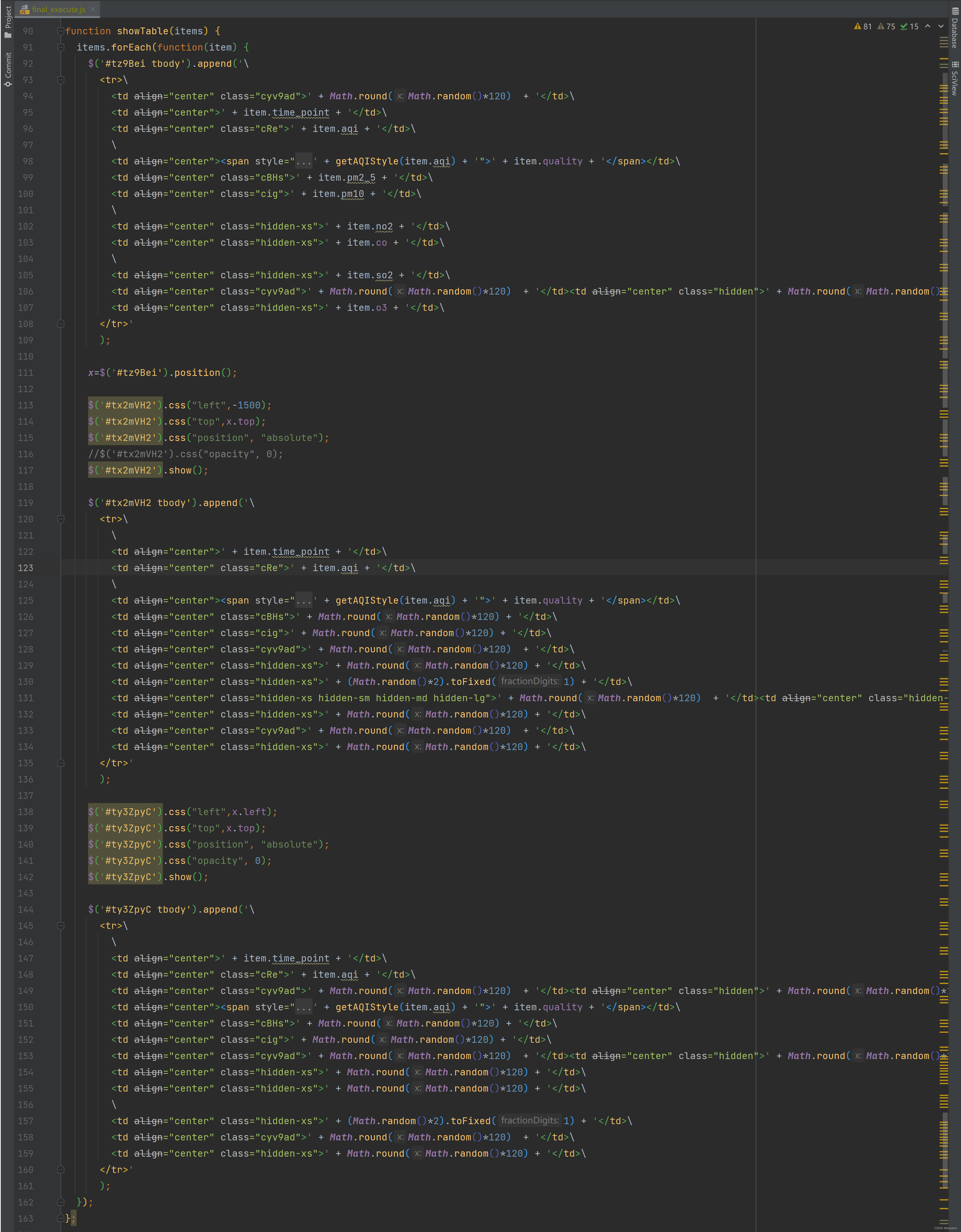 另1个非常明显的佐证是实现页面渲染的 js 代码,在这个名为 showTable 的函数中,入参 items是ajax 接口返回的 json 格式数据,通过 items.foreach 遍历,对3个 Table(3个不同 id)渲染。在每个Table的 td 标签中,都有包含了 假的Math.random() 和 真的item.天气字段 数据。而且出现的位置随机,字段随机。