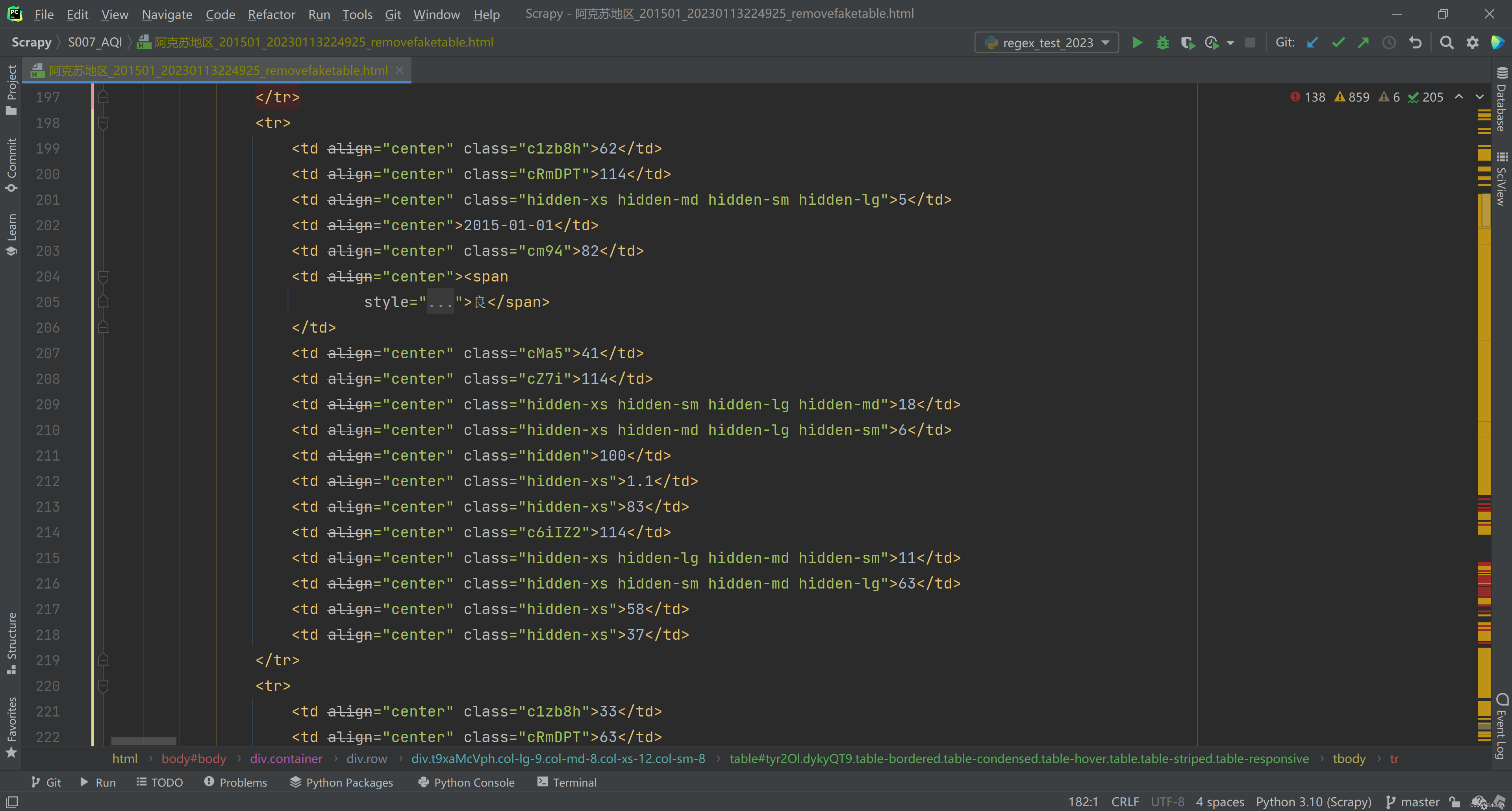 print('{}_{}: total {} tds been found'.format(city, month, len(tds)))# 对假数据的隐藏,网站使用了4种不同的css样式来控制,目前就找到4种。将包含这4种样式的 td 全部替换为空