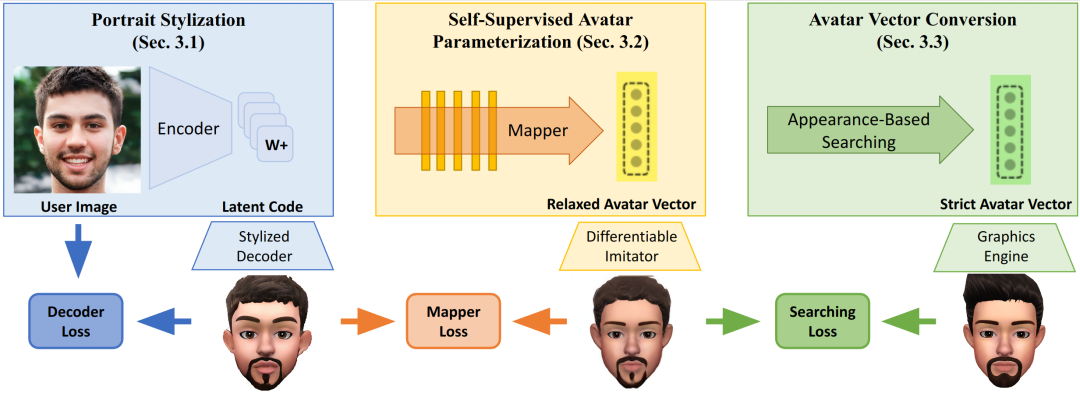 如何让照片变成 3D 头像?论文中介绍了三个主要的步骤。