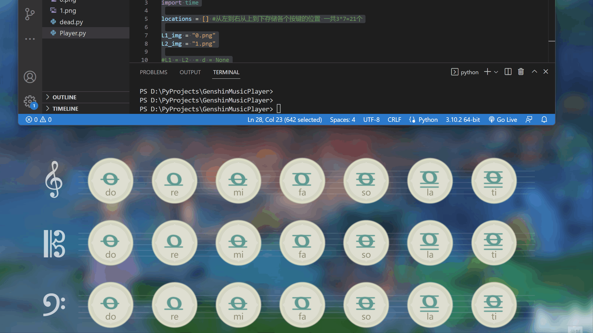 代码测试到一半的时候,我就明白了这个定位方法并不好用。因为我想尽可能适应不一样的游戏窗口大小,所以会适当降低匹配的精度,但是这样就会导致很多匹配的错误,可能匹配某个音匹配了不止三个。。。只要没办法精确区分每个音调的位置,就没办法完成弹奏的任务。