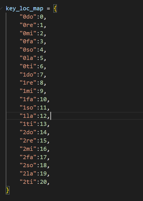 key_loc_map = {"0do":0,"0re":1,"0mi":2,"0fa":3,"0so":4,"0la":5,"0ti":6,"1do":7,"1re":8,"1mi":9,"1fa":10,"1so":11,"1la":12,"1ti":13,"2do":14,"2re":15,"2mi":16,"2fa":17,"2so":18,"2la":19,"2ti":20,