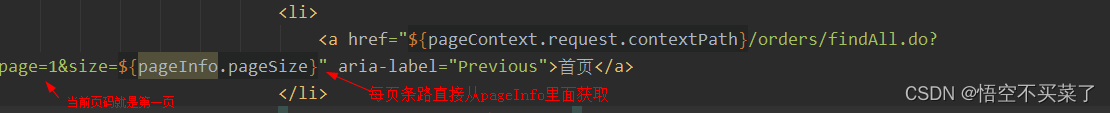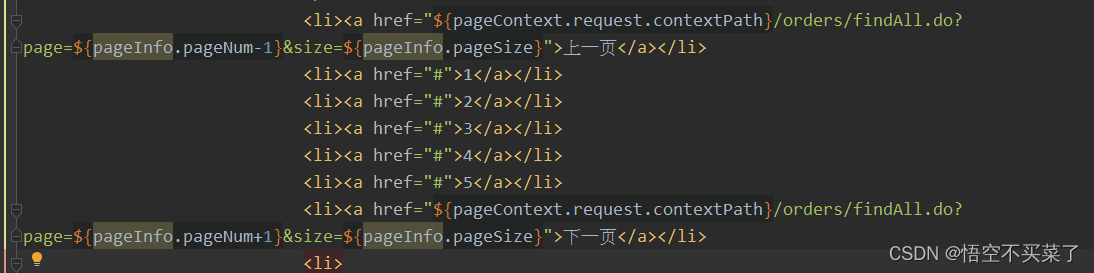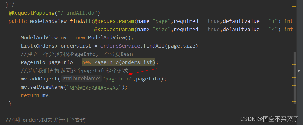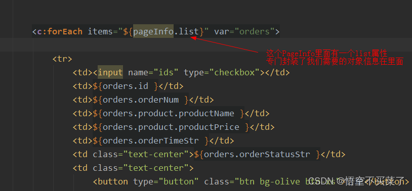 先来看数据展示的部分,之前传过来的是一个ordersList的属性,然后去访问,但是现在传过来的是一个PageInfo对象