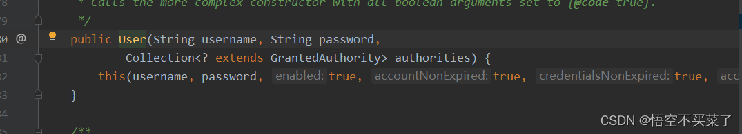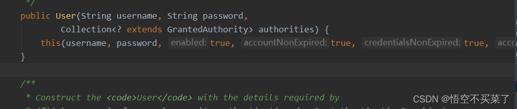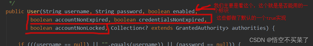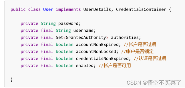 那么怎么通过这个状态限制用户不被登录,我们还是去看一下User这个封装的用户对象,其实想一下都要去找这个User,因为spring-security这个安装框架去访问的用户对象的时候,就是去找UserDetails的实现类