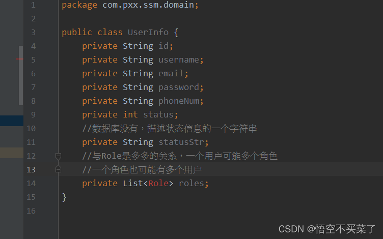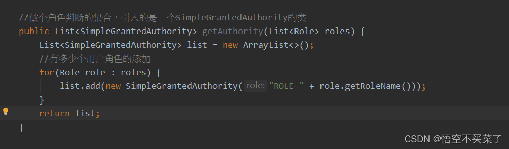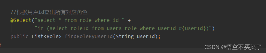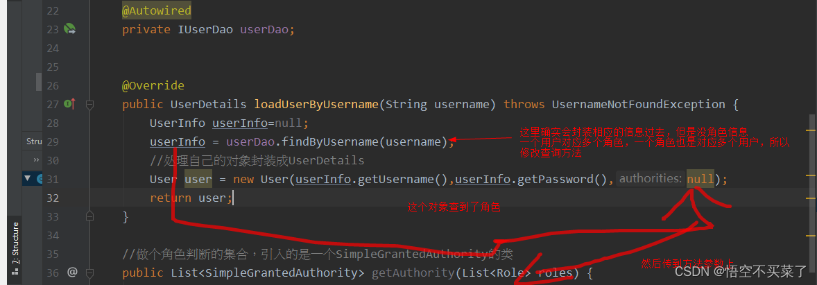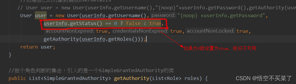 public class UserServiceImpl implements IUserService {@Autowiredprivate IUserDao userDao;@Overridepublic UserDetails loadUserByUsername(String username) throws UsernameNotFoundException {UserInfo userInfo = null;try {userInfo = userDao.findByUsername(username);} catch (Exception e) {e.printStackTrace();}//处理自己的用户对象封装成UserDetails// User user=new User(userInfo.getUsername(),"{noop}"+userInfo.getPassword(),getAuthority(userInfo.getRoles()));User user = new User(userInfo.getUsername(), "{noop}" + userInfo.getPassword(), userInfo.getStatus() == 0 ? false : true, true, true, true, getAuthority(userInfo.getRoles()));return user;}//作用就是返回一个List集合,集合中装入的是角色描述public List getAuthority(List roles) {List list = new ArrayList<>();for (Role role : roles) {list.add(new SimpleGrantedAuthority("ROLE_" + role.getRoleName()));}return list;}