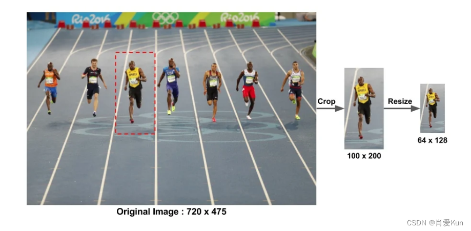 从下面的图片可以看到,原图像大小为720×475,裁剪成大小为64×128个像素的图片,然后可以被分割成128个8*8大小的网格cell,每个网格cell都会计算一个梯度直方图。8×8像素大小的网格cell可以提供了一个紧凑(compact)/压缩的表示。