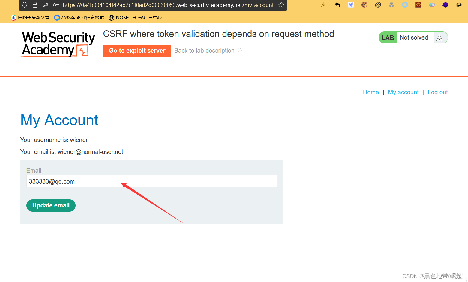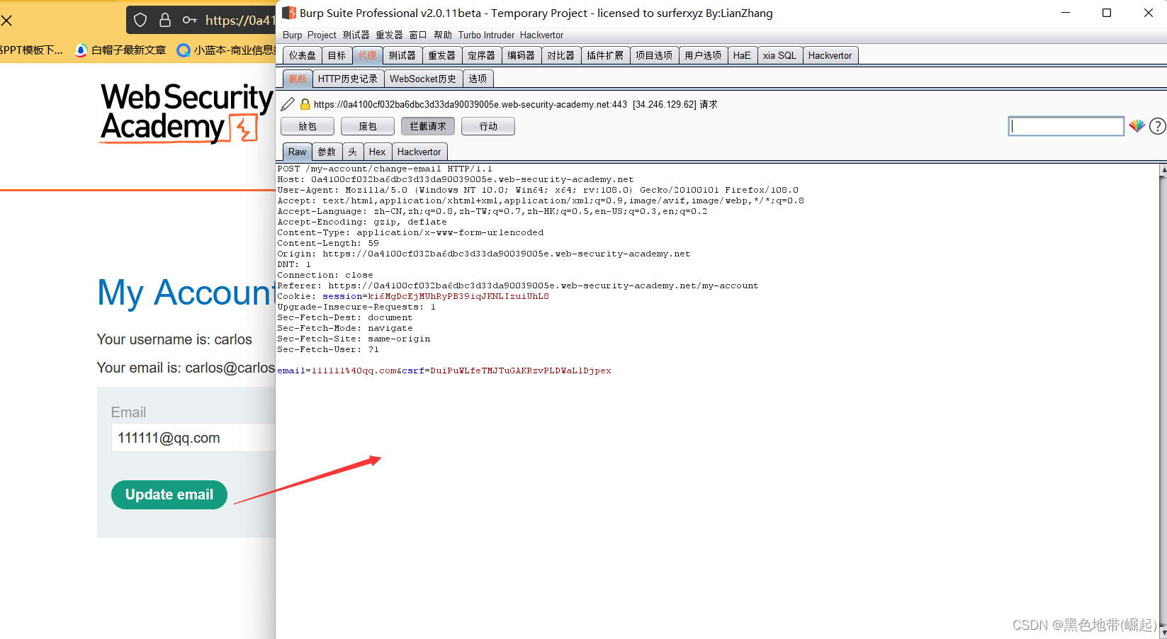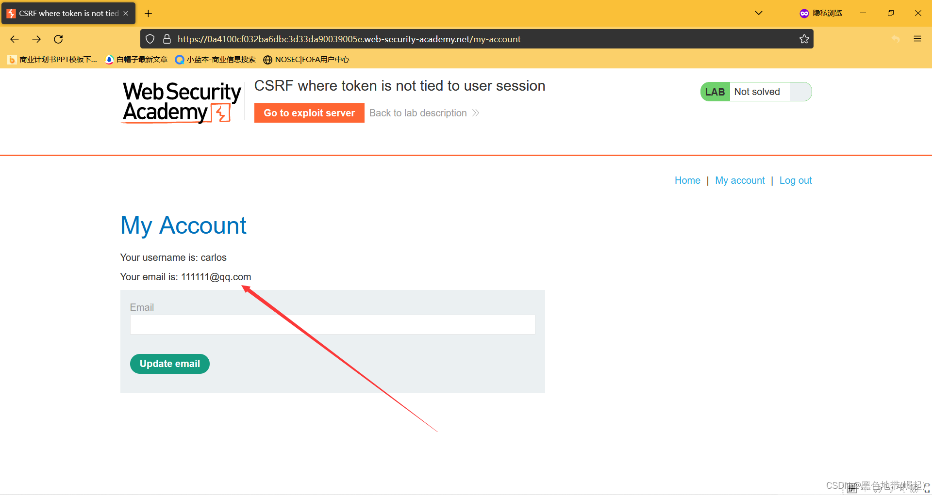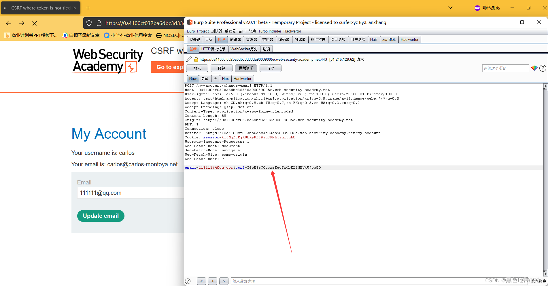 1、这个实验室的电子邮件更改功能对 CSRF 来说是脆弱的。它使用令牌试图防止 CSRF 攻击,但没有集成到站点的会话处理系统中。