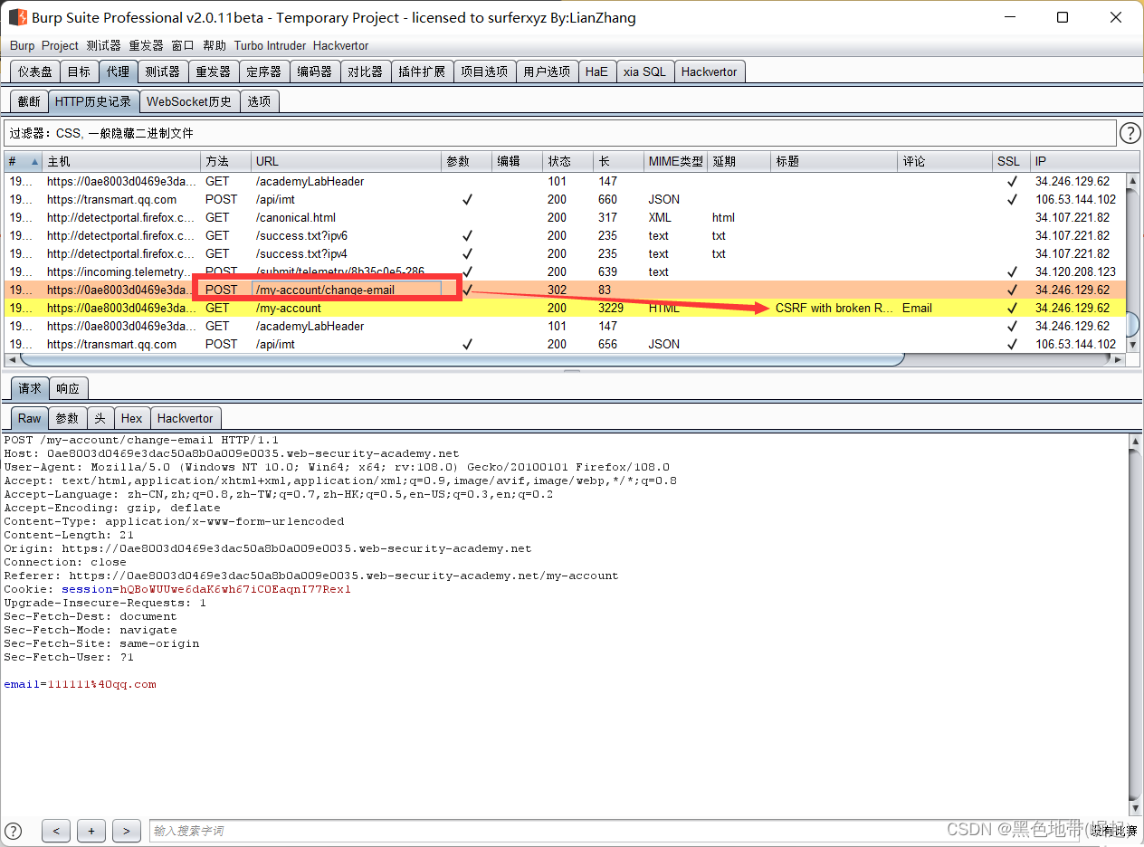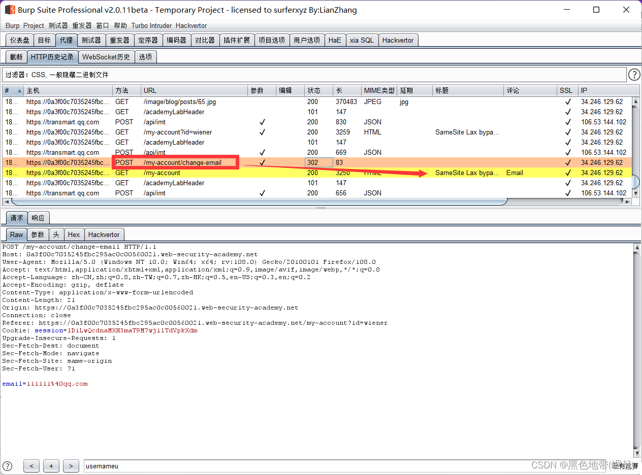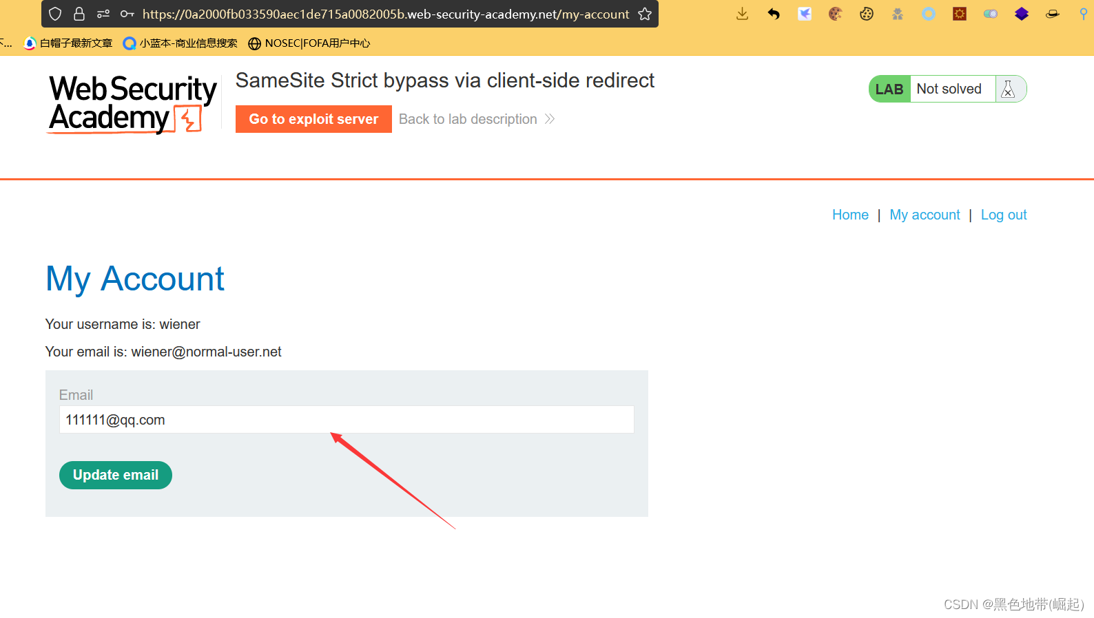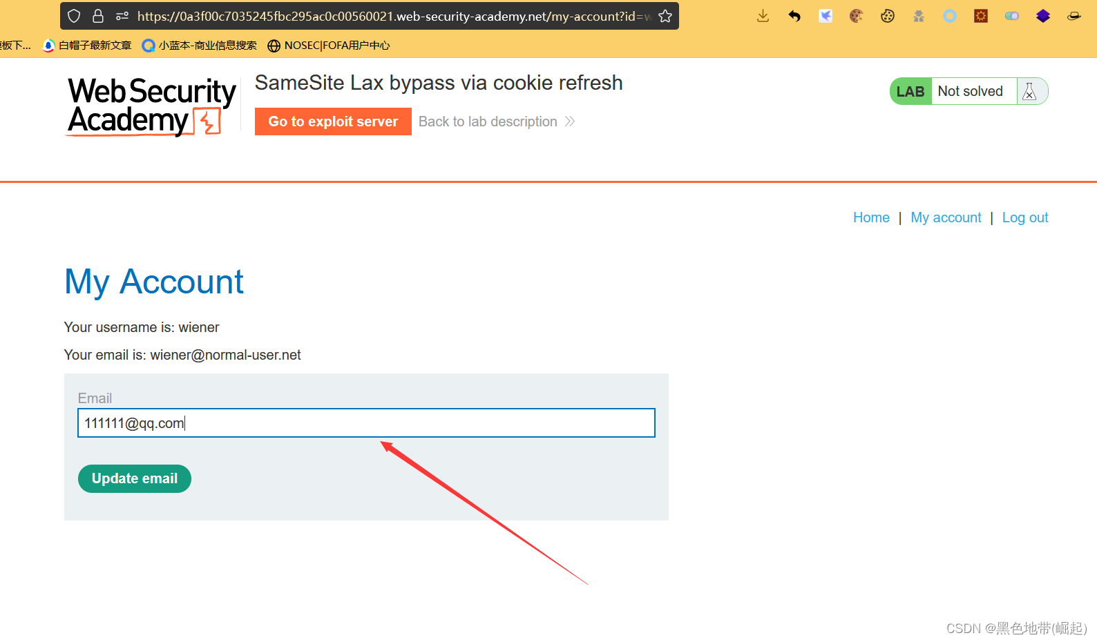 1、这个实验室的电子邮件更改功能对 CSRF 来说是脆弱的。它使用令牌试图防止 CSRF 攻击,但没有集成到站点的会话处理系统中。