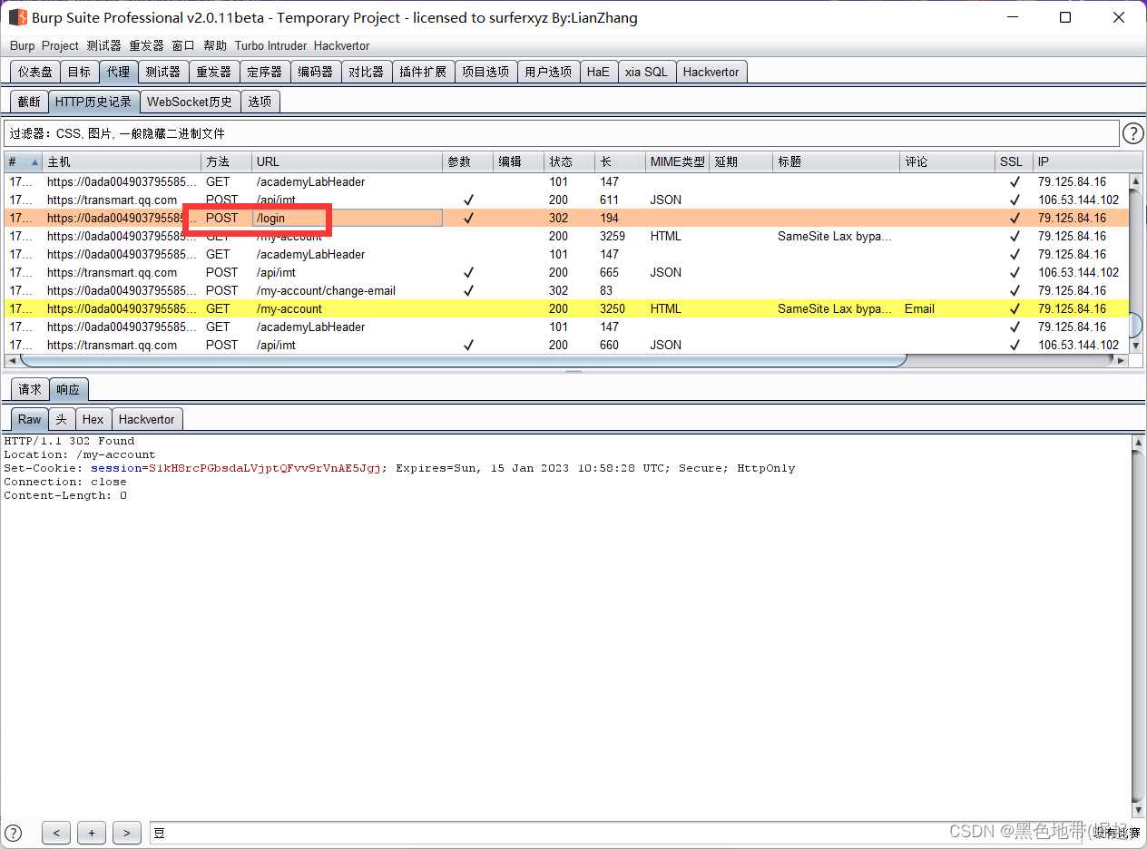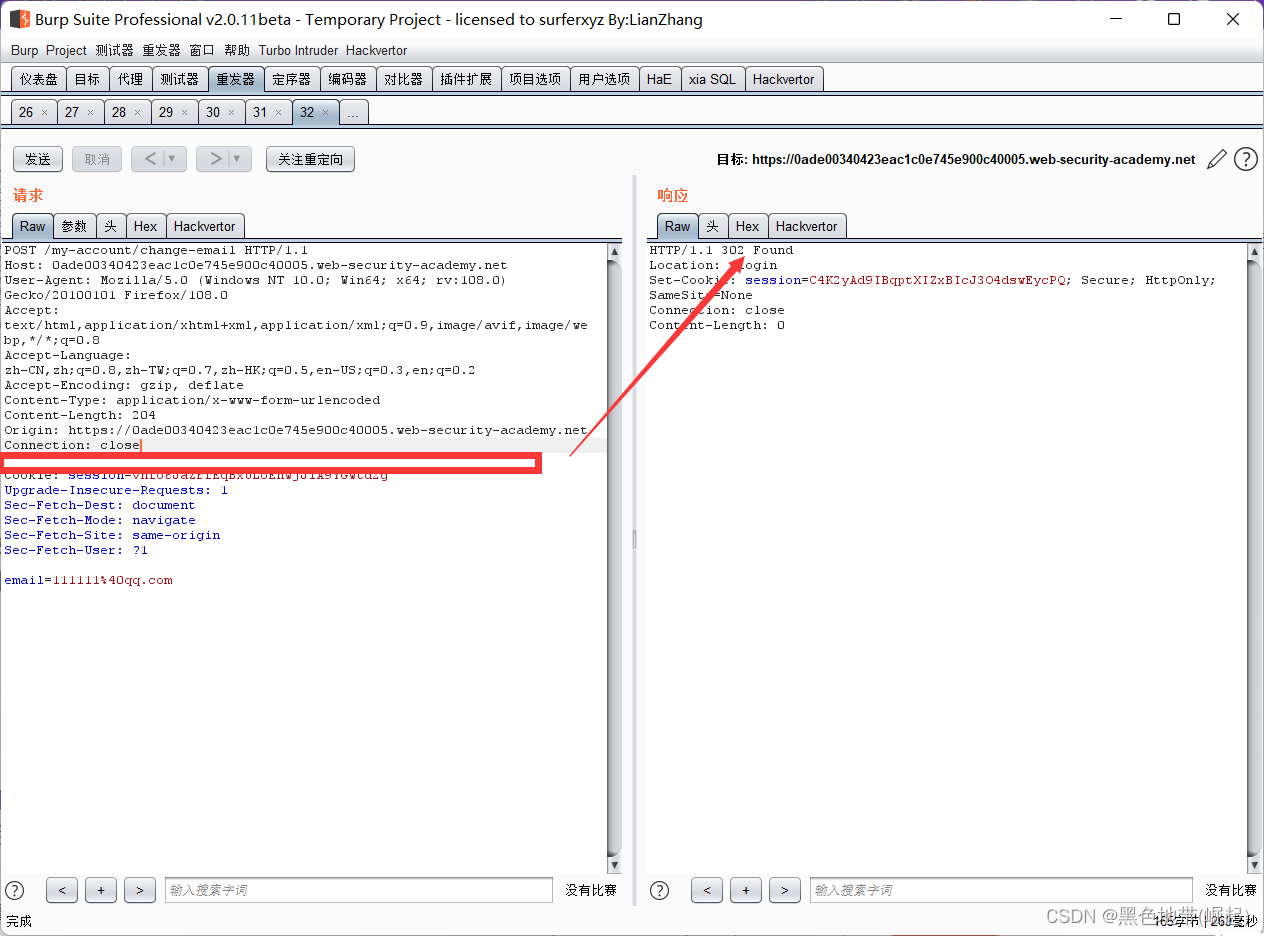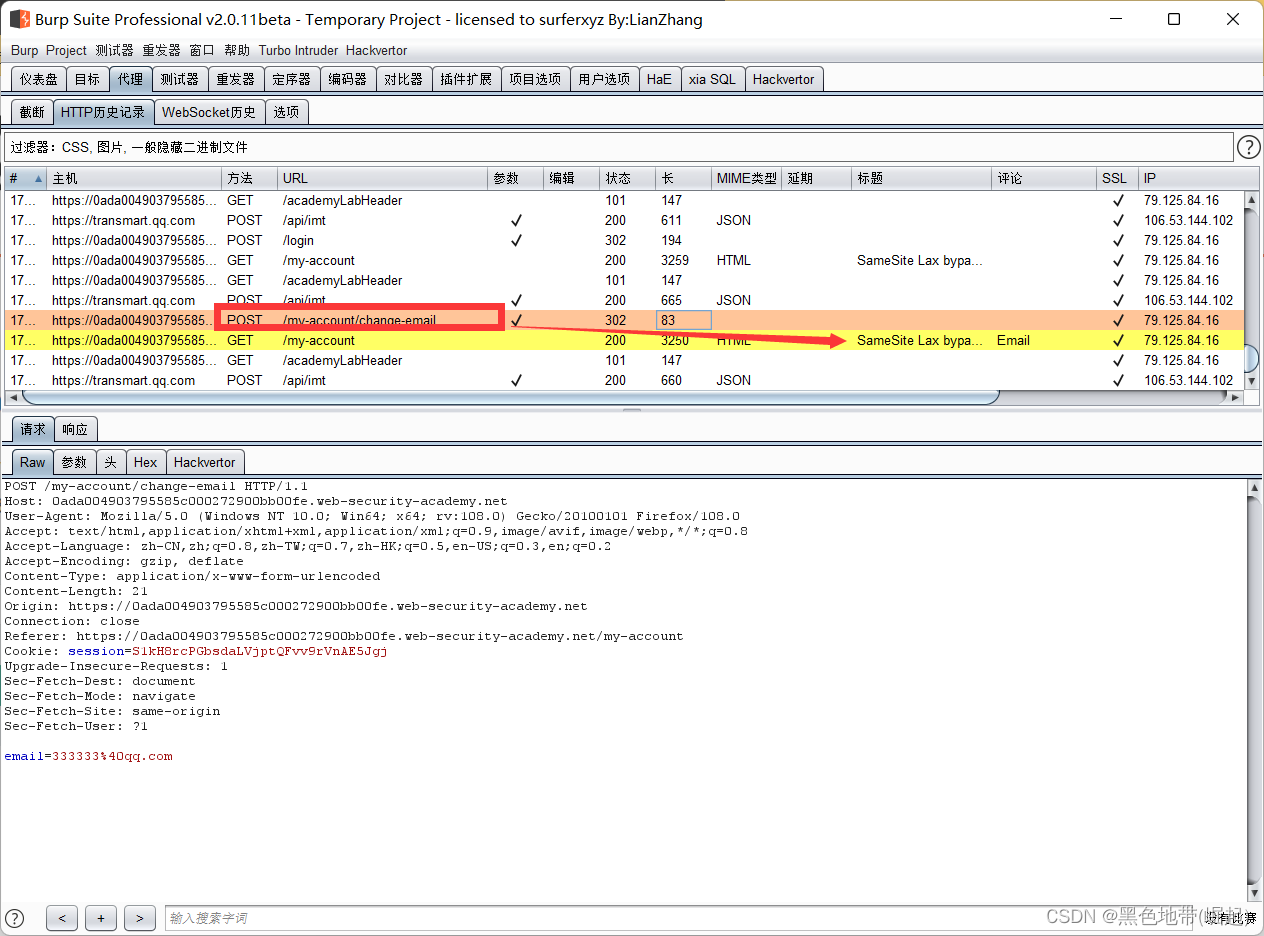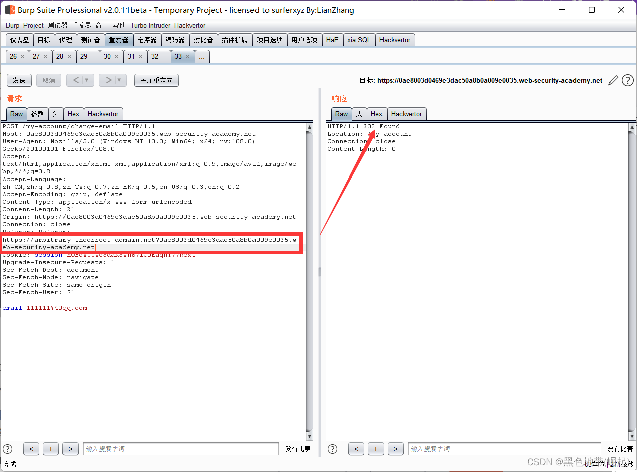 1、这个实验室的电子邮件更改功能对 CSRF 来说是脆弱的。它使用令牌试图防止 CSRF 攻击,但没有集成到站点的会话处理系统中。
