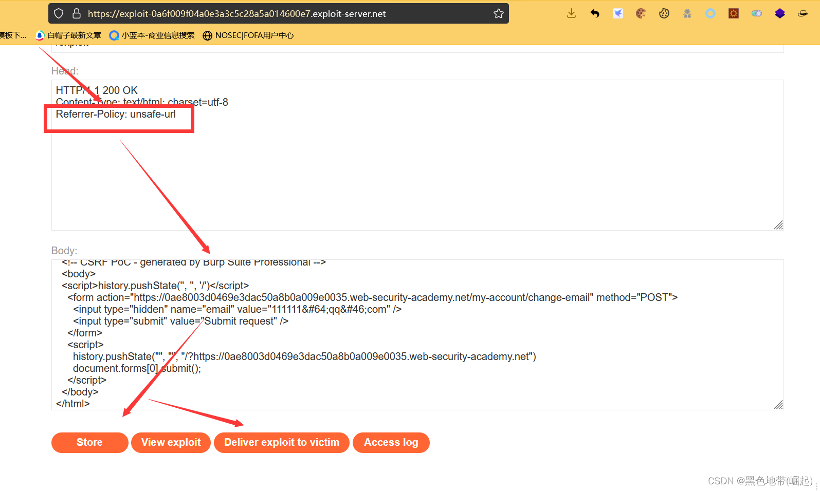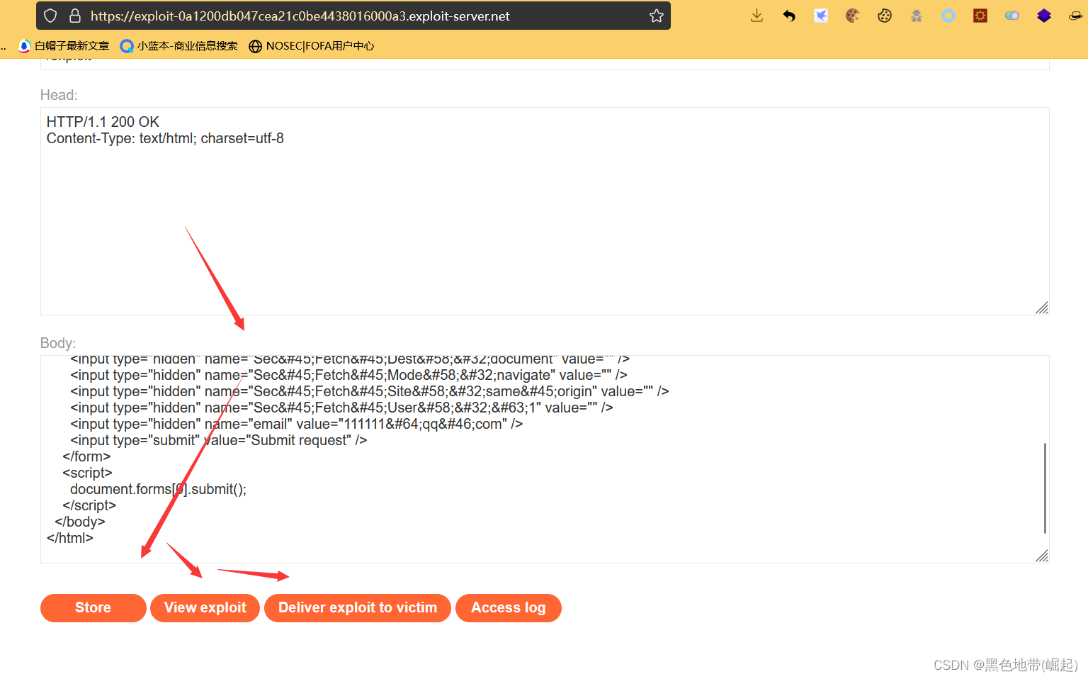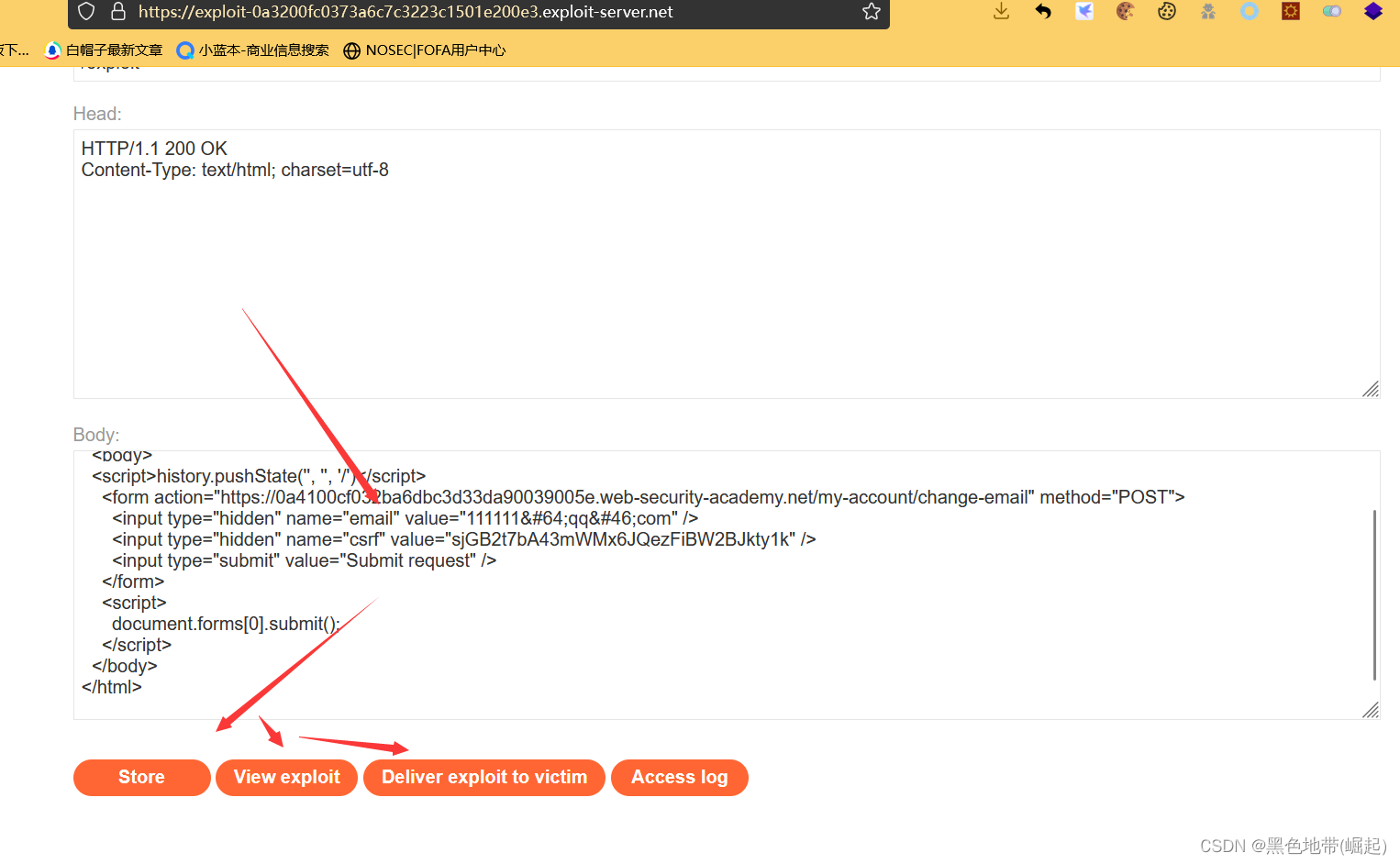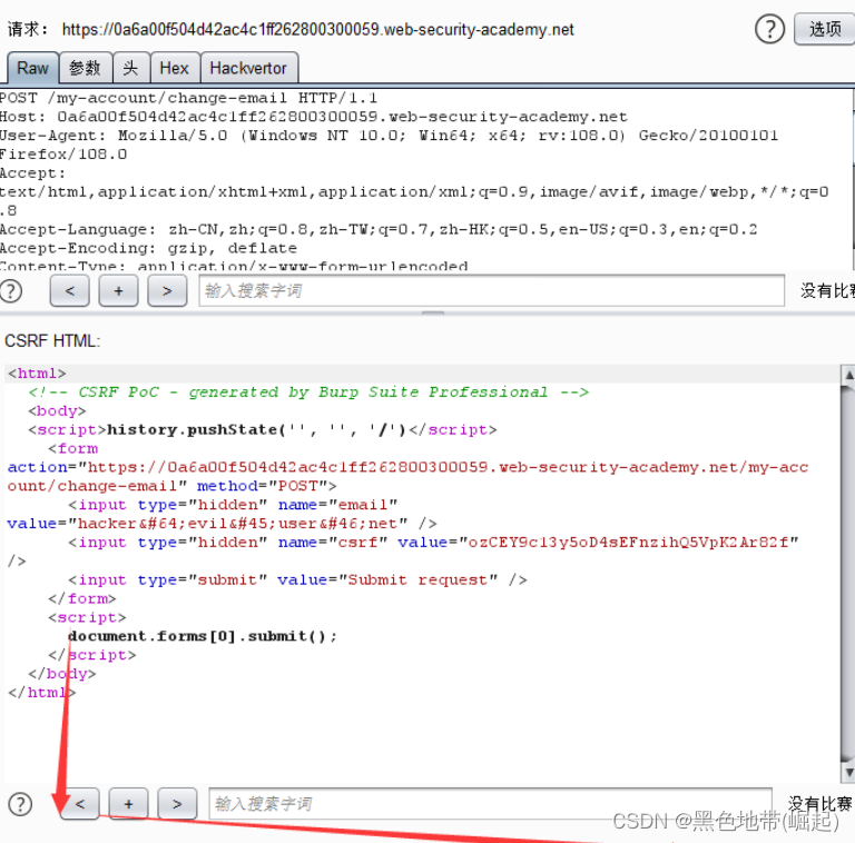 2、解决实验:使用漏洞攻击服务器托管一个HTML页面,该页面使用CSRF攻击来更改查看者的电子邮件地址