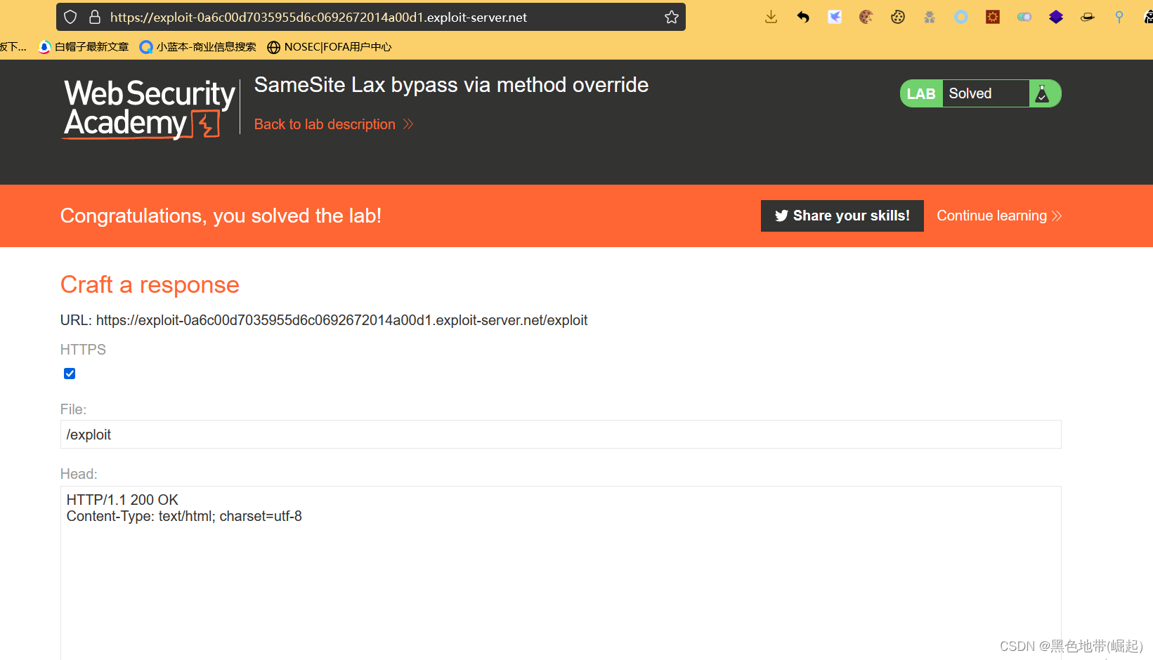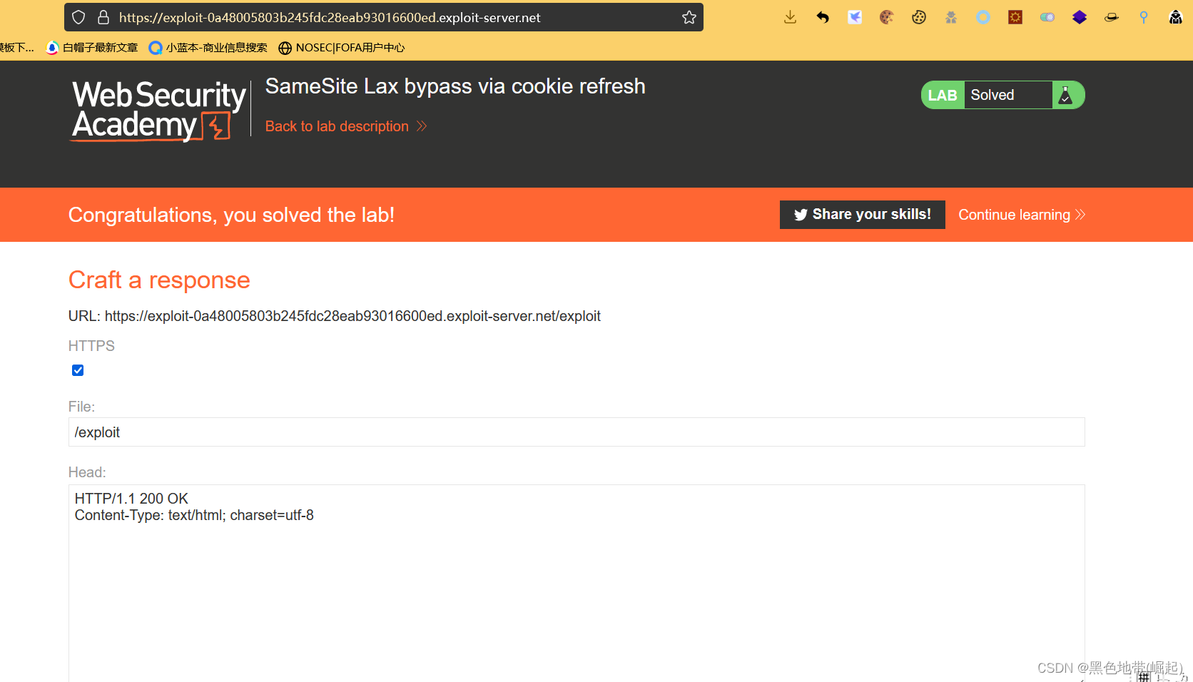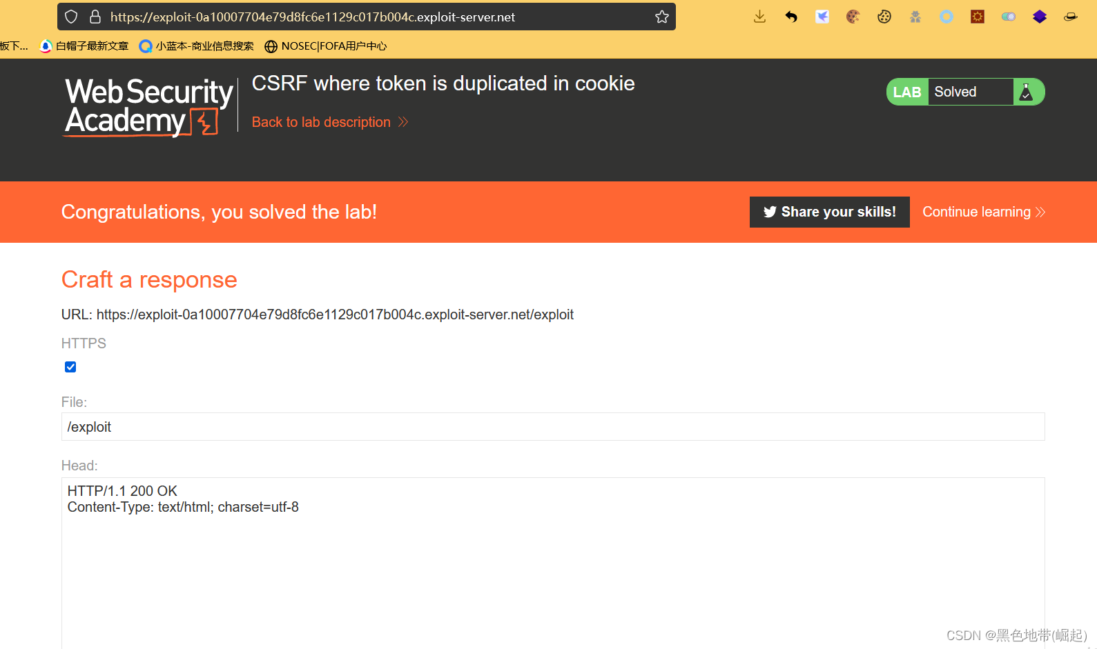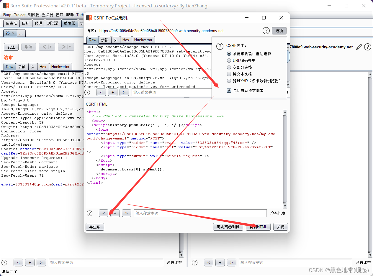 2、解决实验:使用漏洞攻击服务器托管一个HTML页面,该页面使用CSRF攻击来更改查看者的电子邮件地址