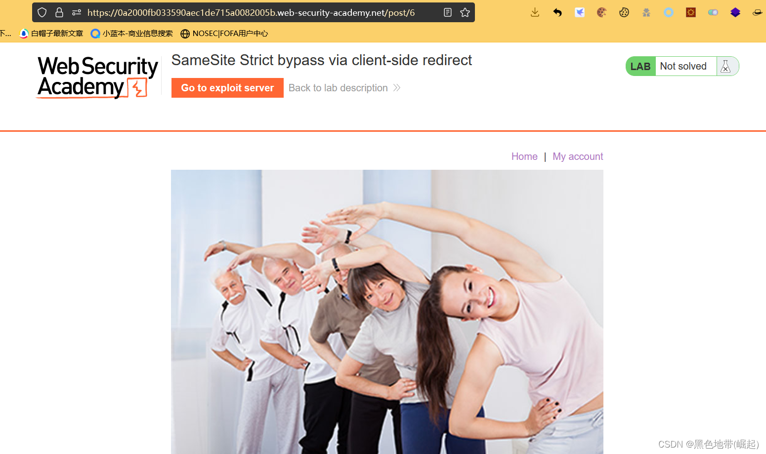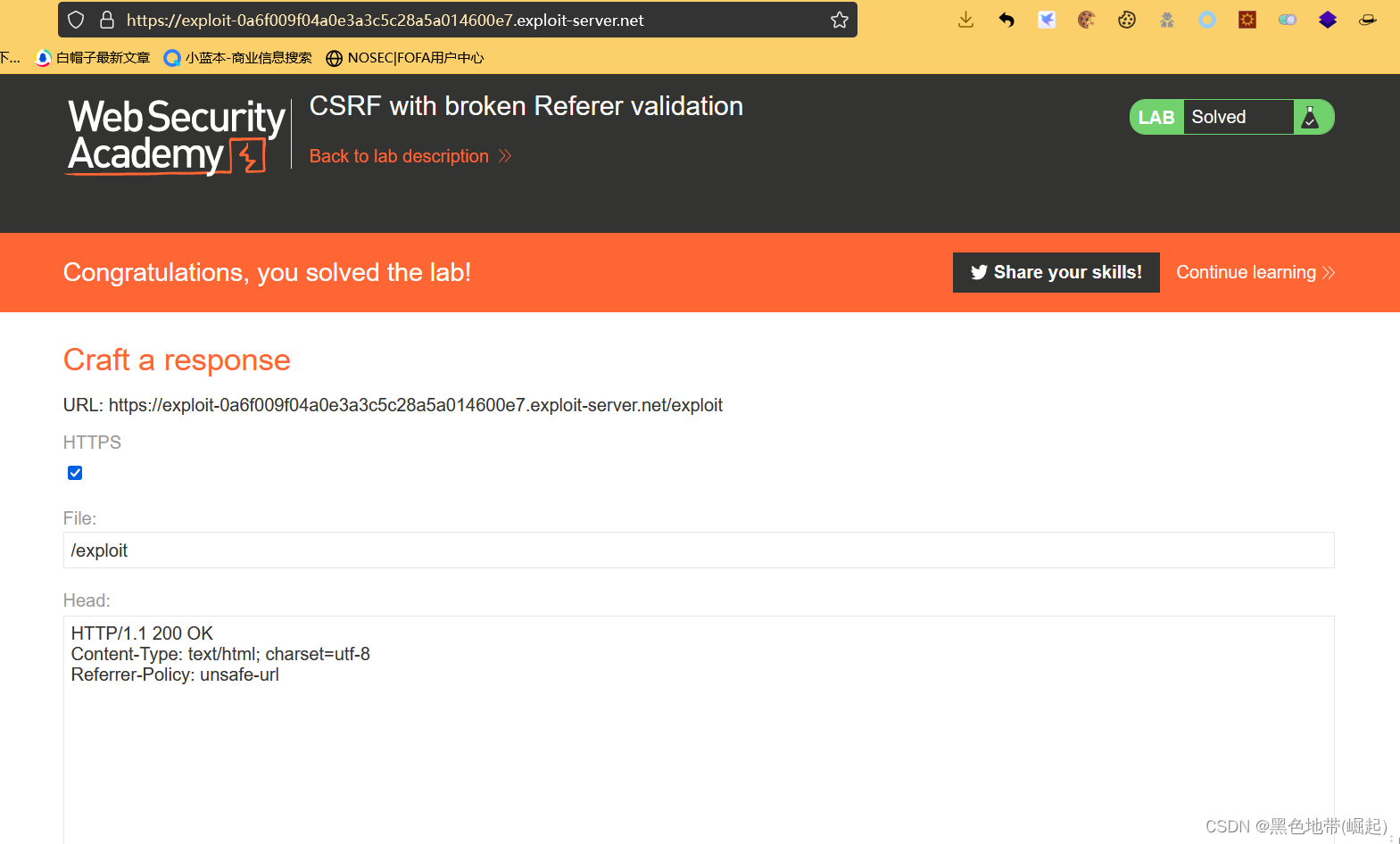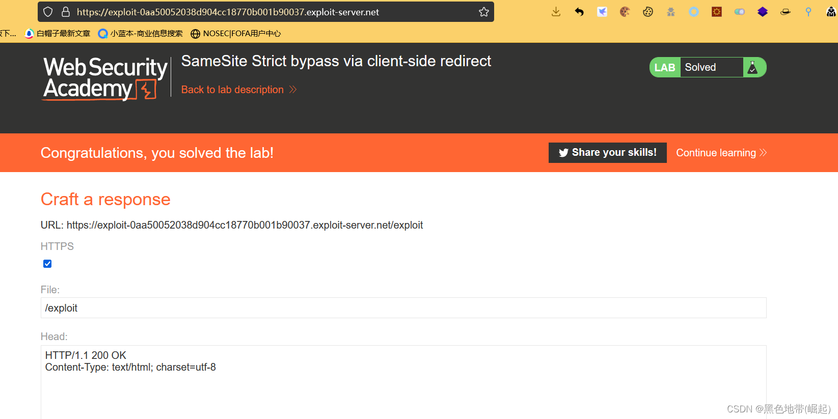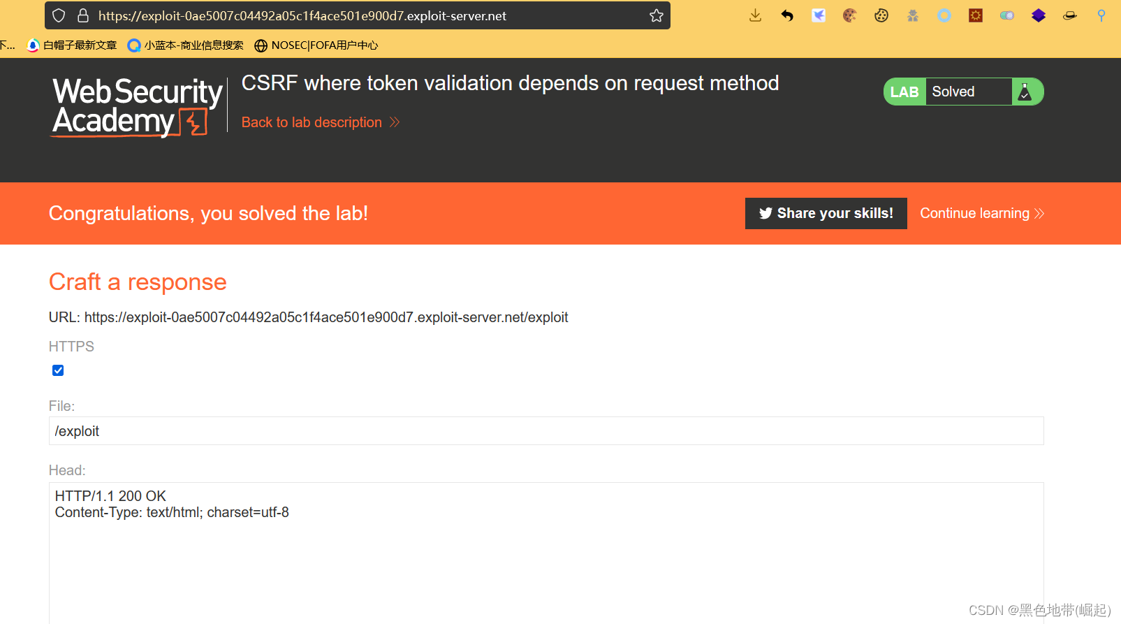 2、解决实验:使用漏洞攻击服务器托管一个HTML页面,该页面使用CSRF攻击来更改查看者的电子邮件地址