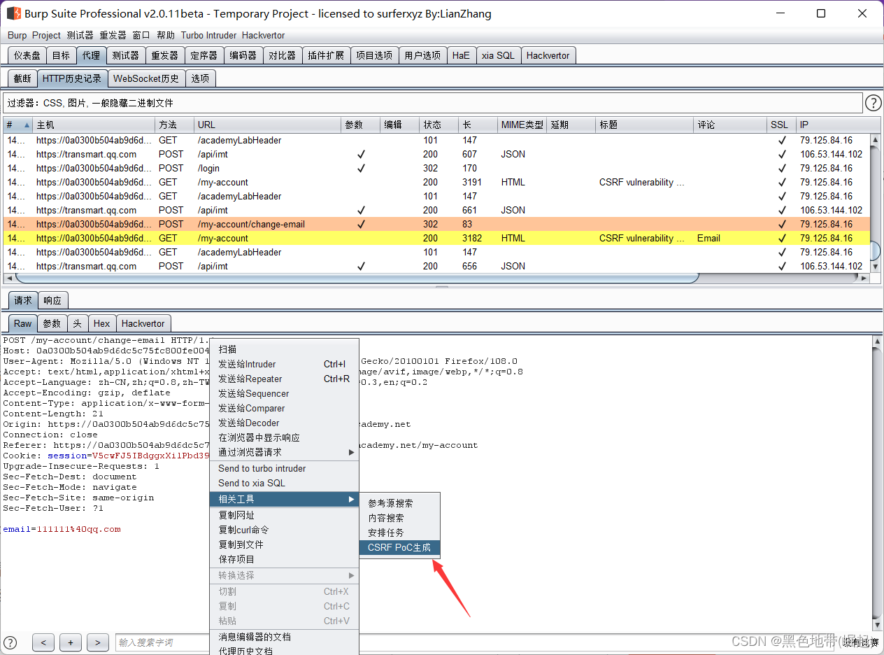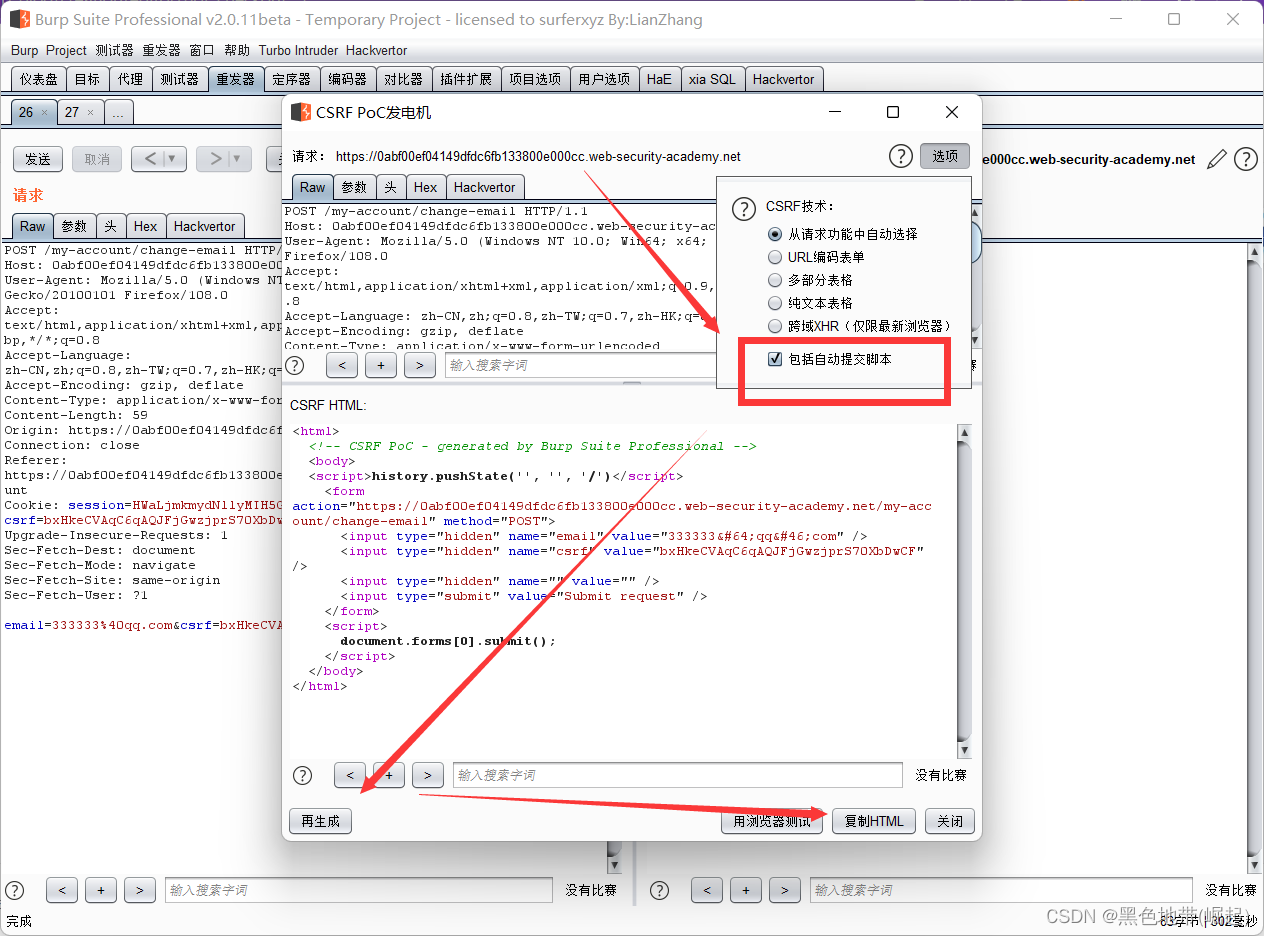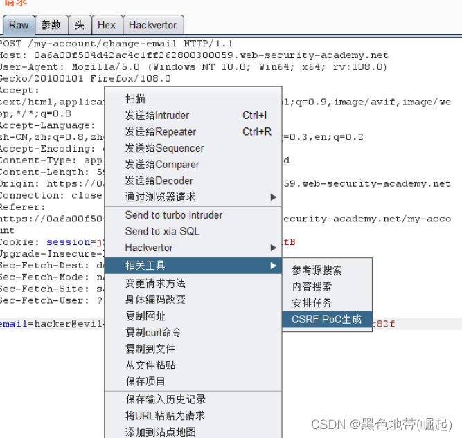 1、手动创建CSRF利用所需的HTML可能很麻烦,特别是在所需请求包含大量参数或请求中存在其他异常的情况下。构建CSRF利用漏洞攻击的最简单方法是使用 CSRF PoC发生器 内置于BP专业版: