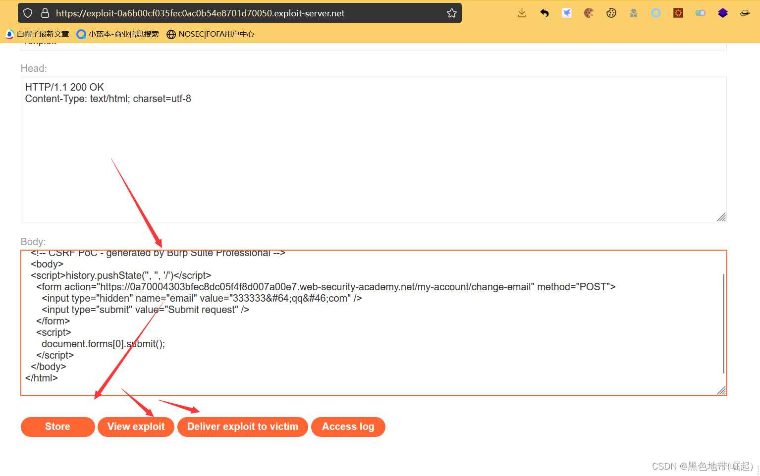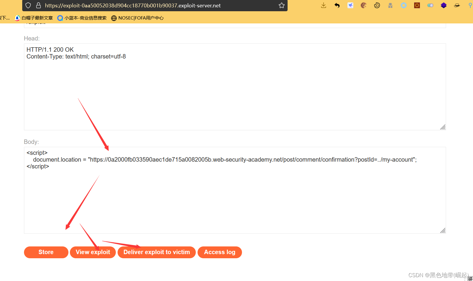 转到漏洞利用服务器,将漏洞利用HTML粘贴到“正文”部分,然后单击store“存储”。