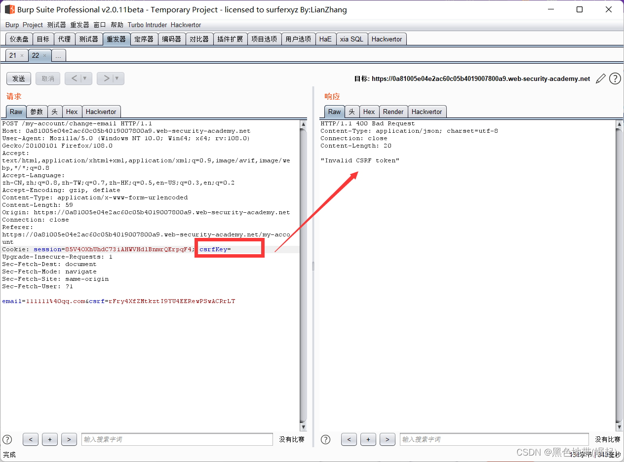 将请求发送到Burp Repeater,更改csrf参数的值,则请求被拒绝。