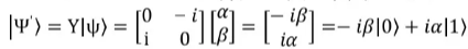 假设,Pauli-Y门作用在任意量子态|ψ〉= α|0〉+ β|1〉上面,得到新的量子态为: