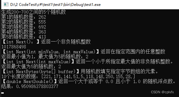 Console.Write($"10个长度的数据:{sb.ToString()}\n"); Console.Write($"【double NextDouble()】返回一个大于或等于 0.0 且小于 1.0 的随机浮点数。\n");