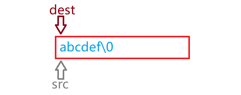 之后\0被a覆盖。接着在a后边追加bcdef直到*dest被赋值成\0停止循环。