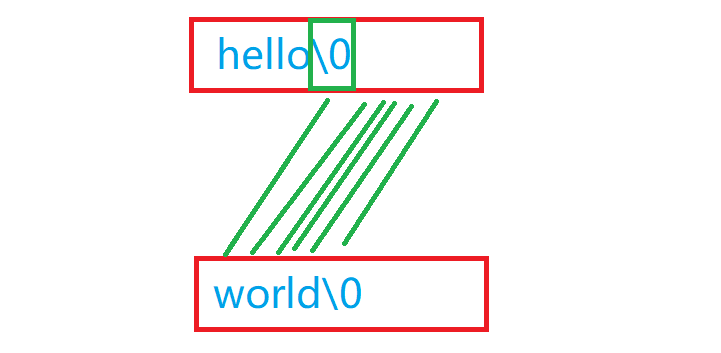编译器先去目标空间中找到\0,从源字符串中,从w开始\0覆盖掉,然后依次把字符传到目标空间,直到遇到\0结束。
