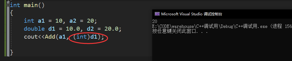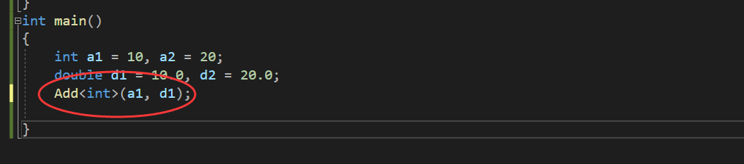 {int a1 = 10, a2 = 20;double d1 = 10.0, d2 = 20.0;Add(a1, d1);}