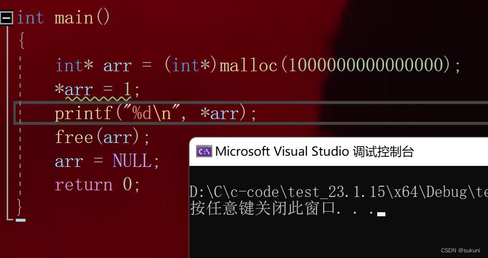 {int* arr = (int*)malloc(1000000000000000);*arr = 1;printf("%d\n", *arr);free(arr);arr = NULL;return 0;