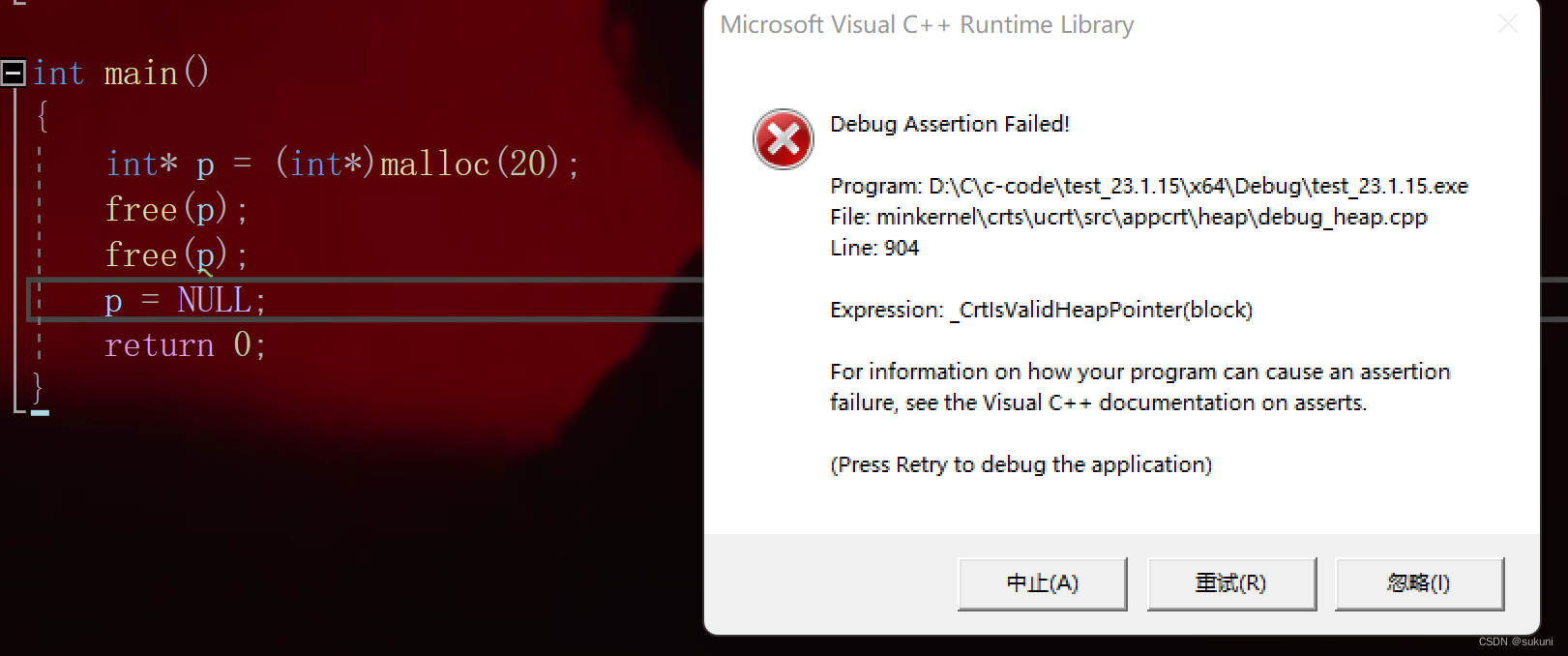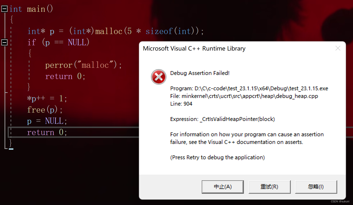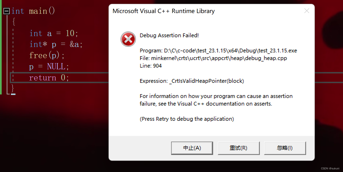 {int* p = (int*)malloc(5 * sizeof(int));if (p == NULL){perror("malloc");return 0;}*p++ = 1; //改变p指针的位置free(p);p = NULL;return 0;