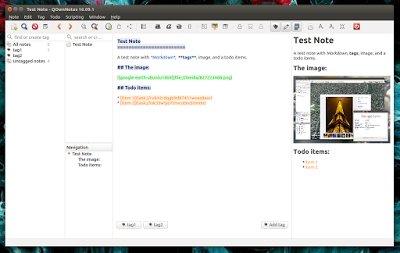 我提到的上述特点,比如恢复之前的笔记,只能在 ownCloud 下可用(尽管 Dropbox 和其他类似的也提供恢复以前的文件的服务,但是你不能在 QOwnnotes 中直接访问到)。鉴于 QOwnNotes 有这么多优点,它支持 Markdown 语言(内置了 Markdown 预览模式),可以标记笔记,对标记和笔记进行搜索,在笔记中加入超链接,也可以插入图片: