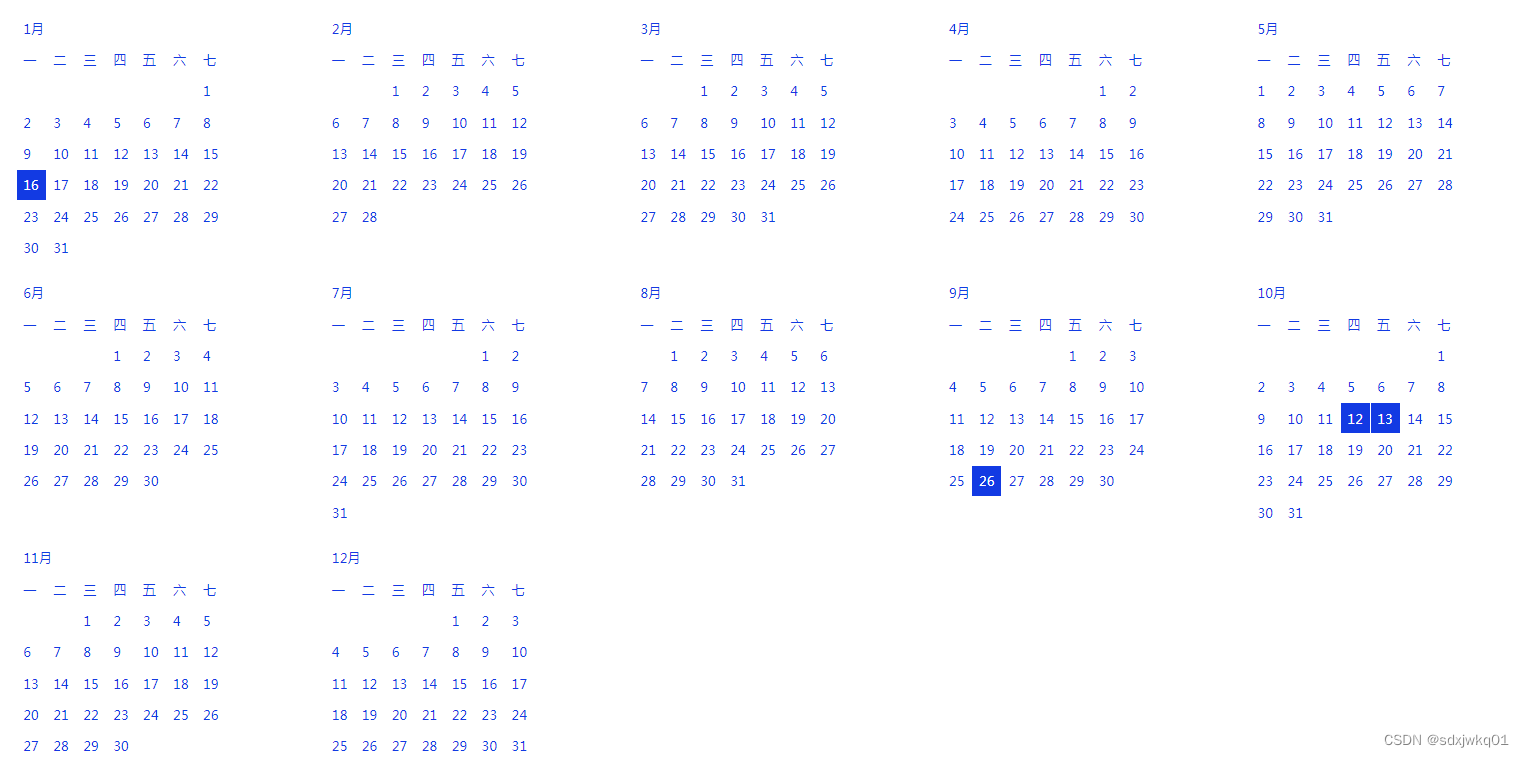 drawDateByYear()方法画出全年的日历,也可以用drawDateByMonth()方法画出某个月的单月日历,默认将日历dom插入到body里,也可以通过传入parent修改日历容器,例如某个div,d.drawDateByYear(2023,5,function(v){