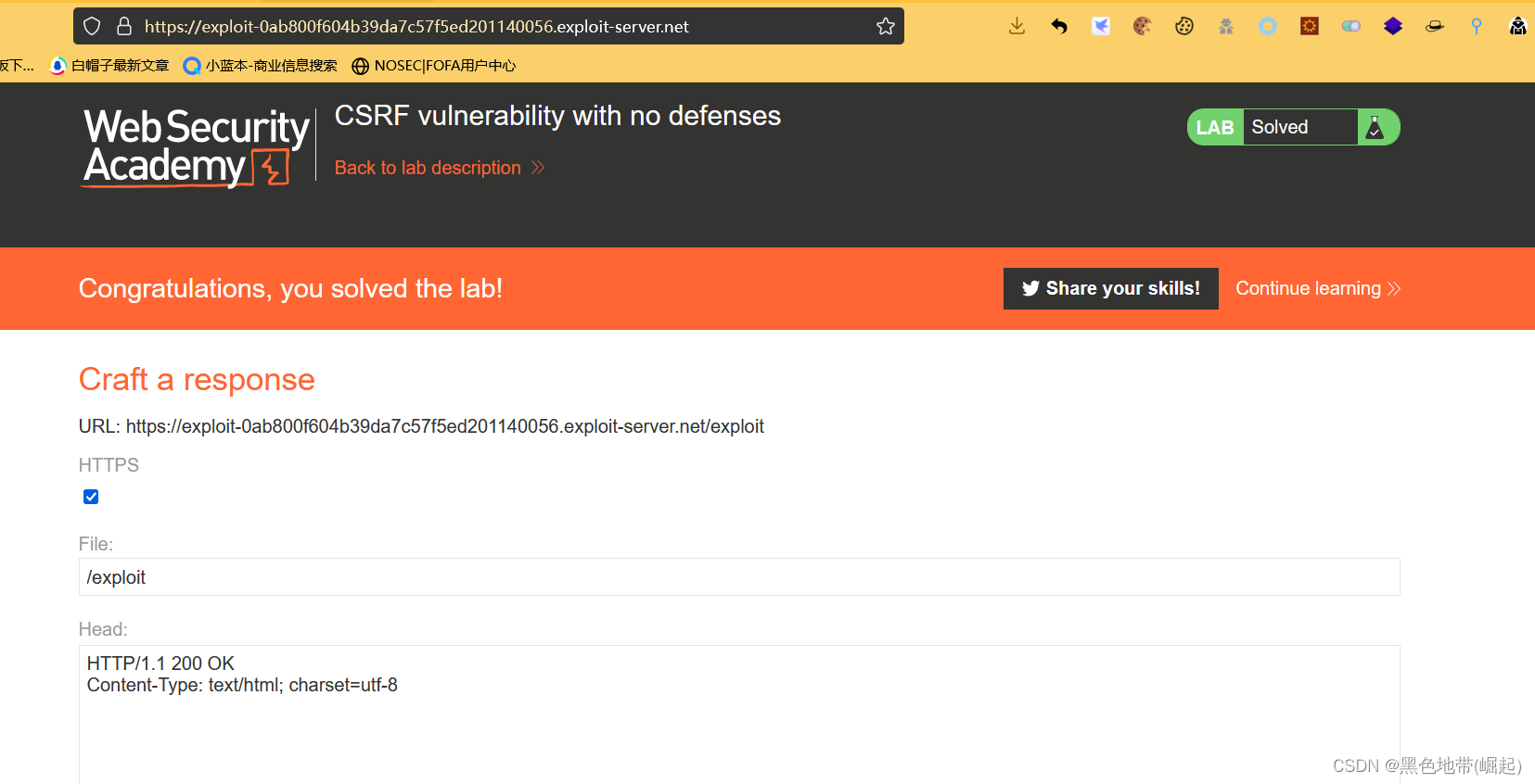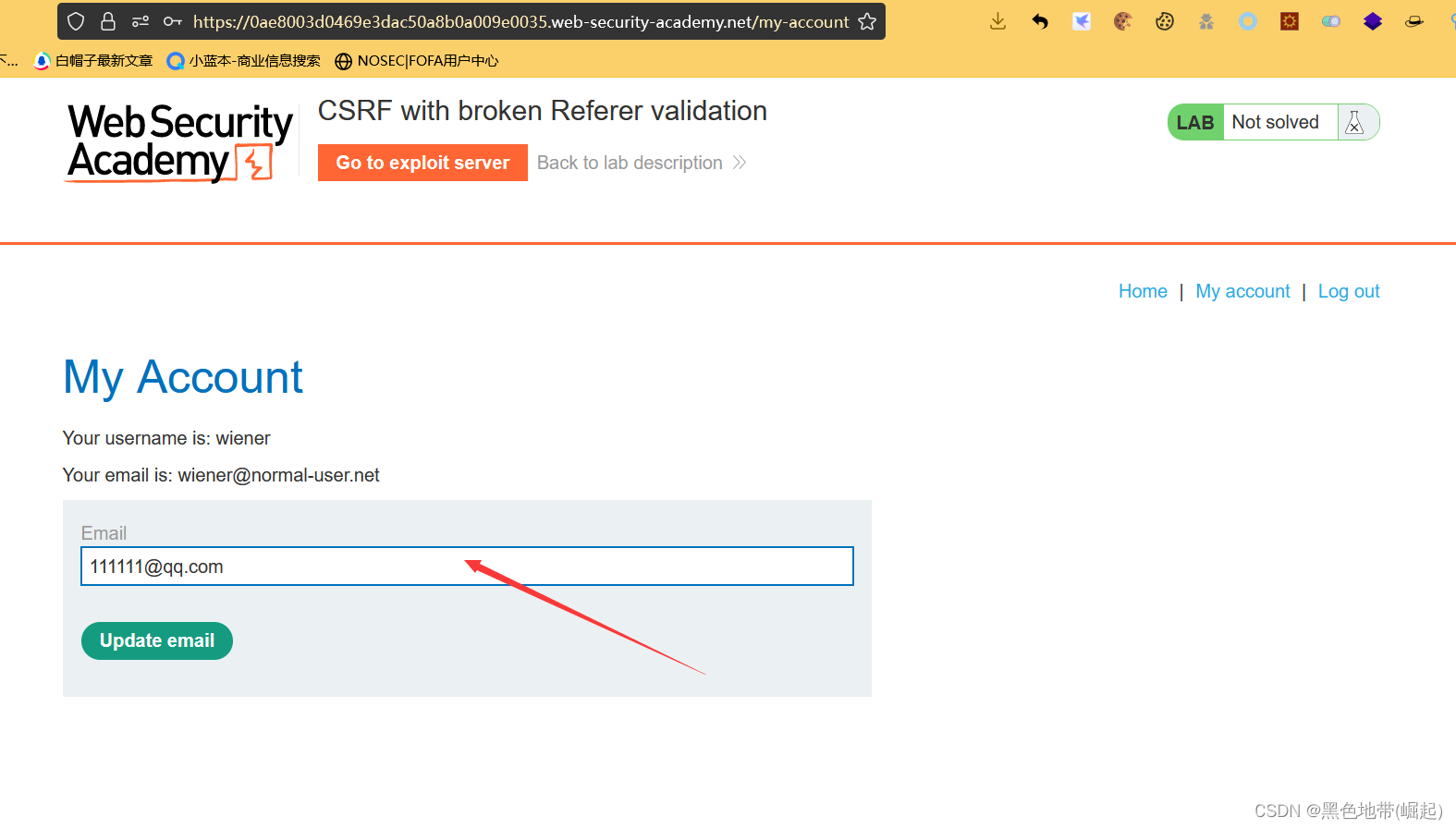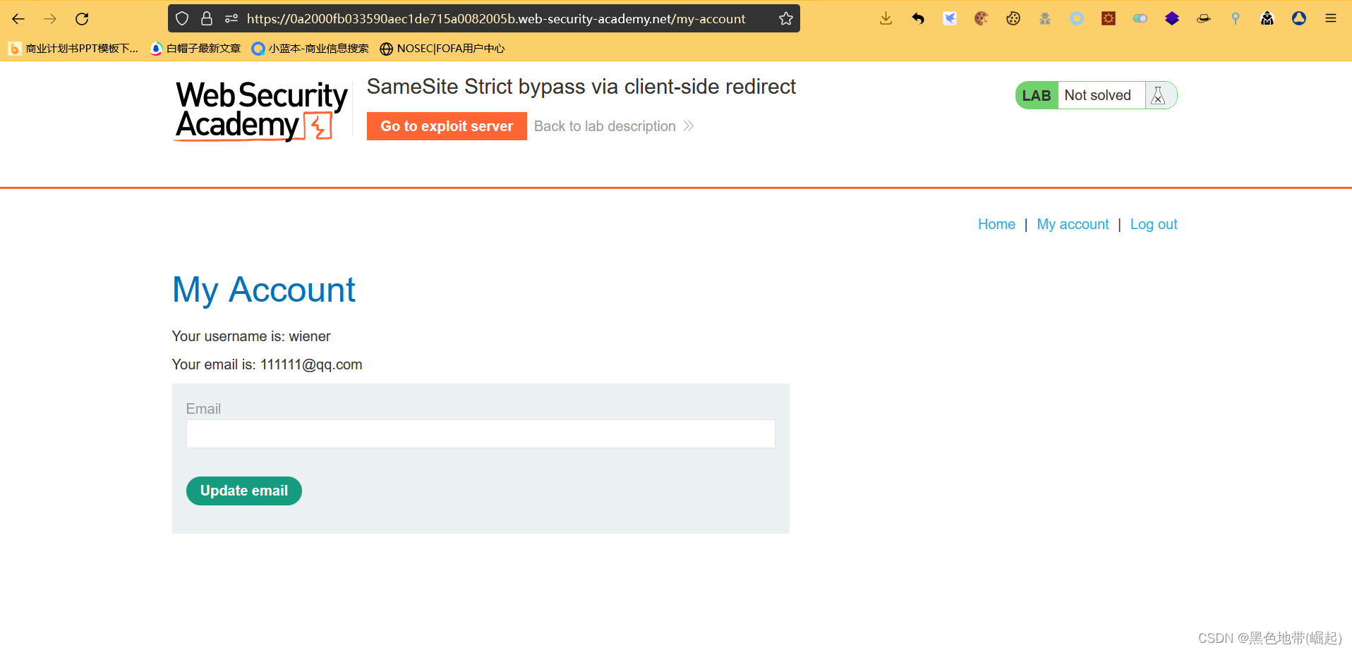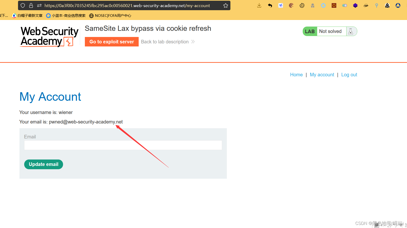 解决实验:使用漏洞攻击服务器托管一个HTML页面,该页面使用CSRF攻击来更改查看者的电子邮件地址。