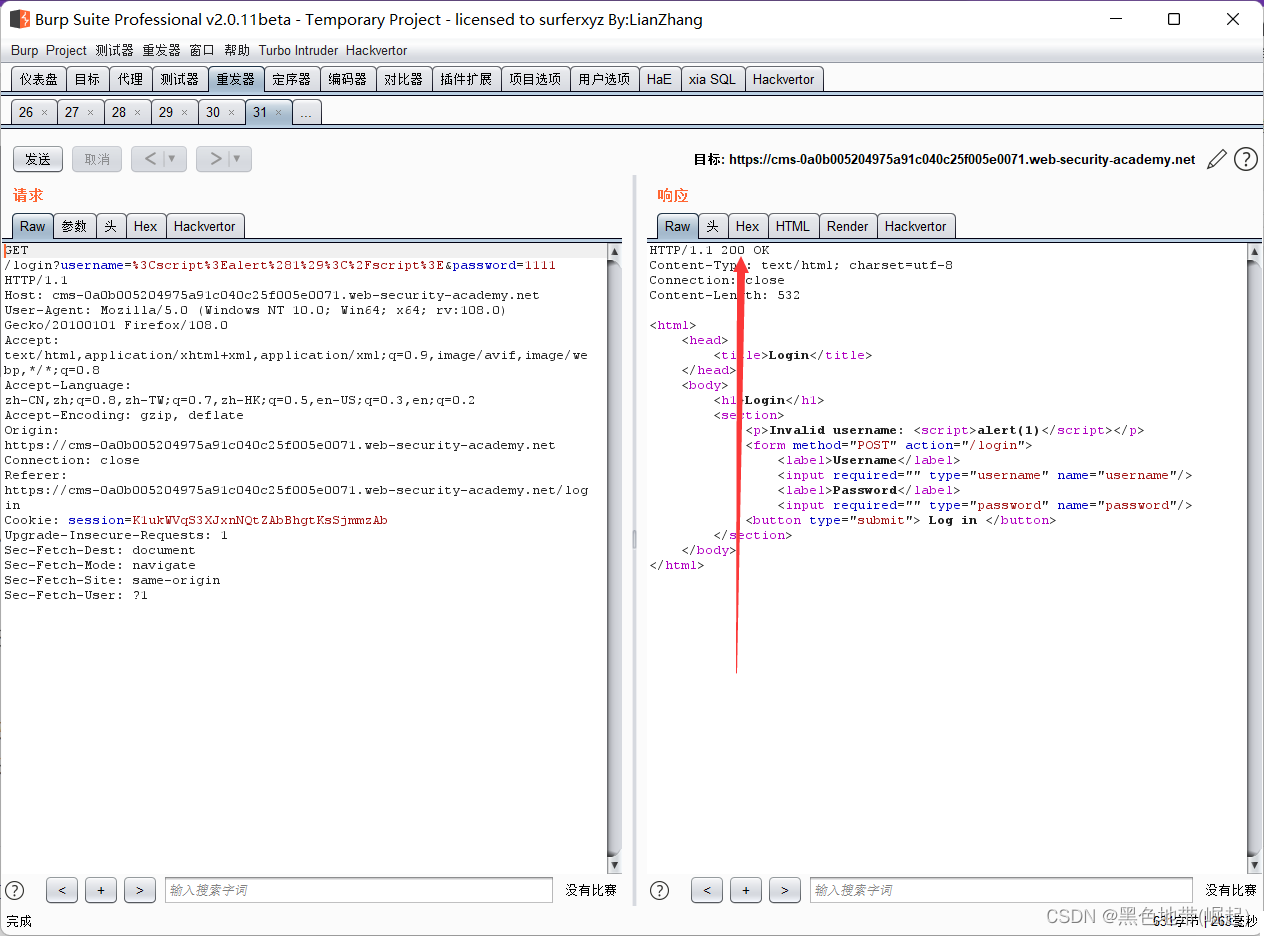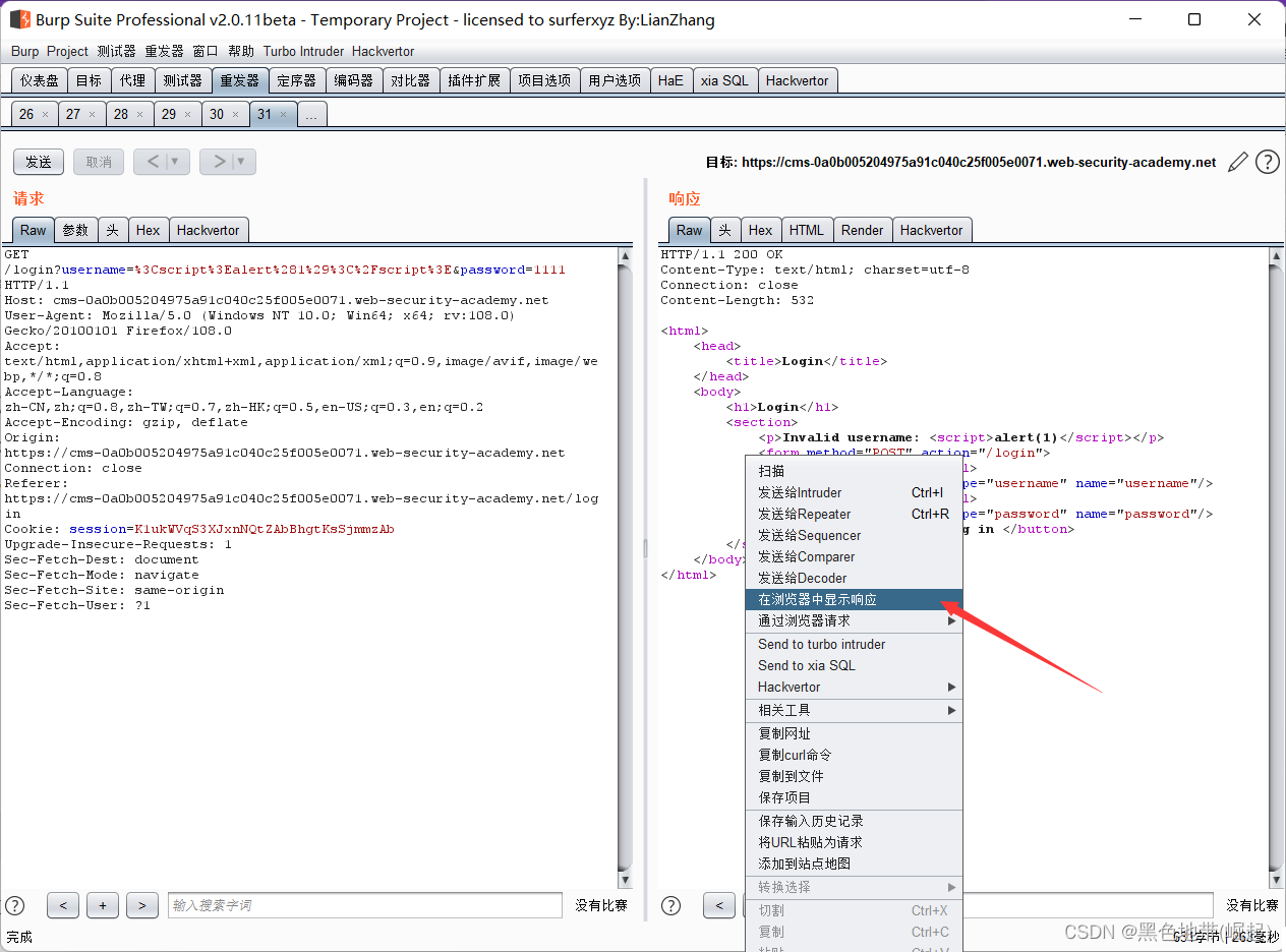 将包含XSS有效负载的POST /登录请求发送到Burp Repeater。