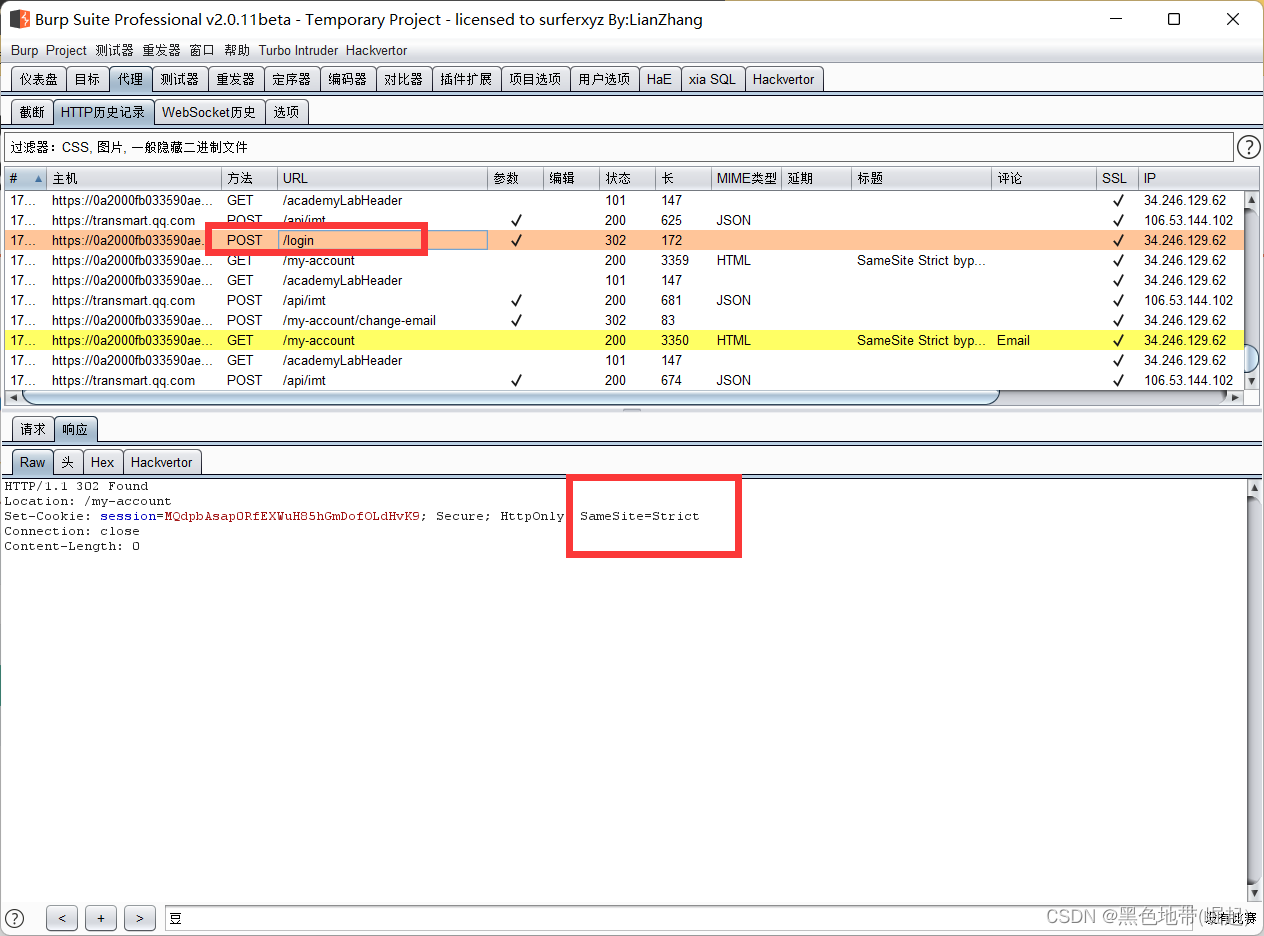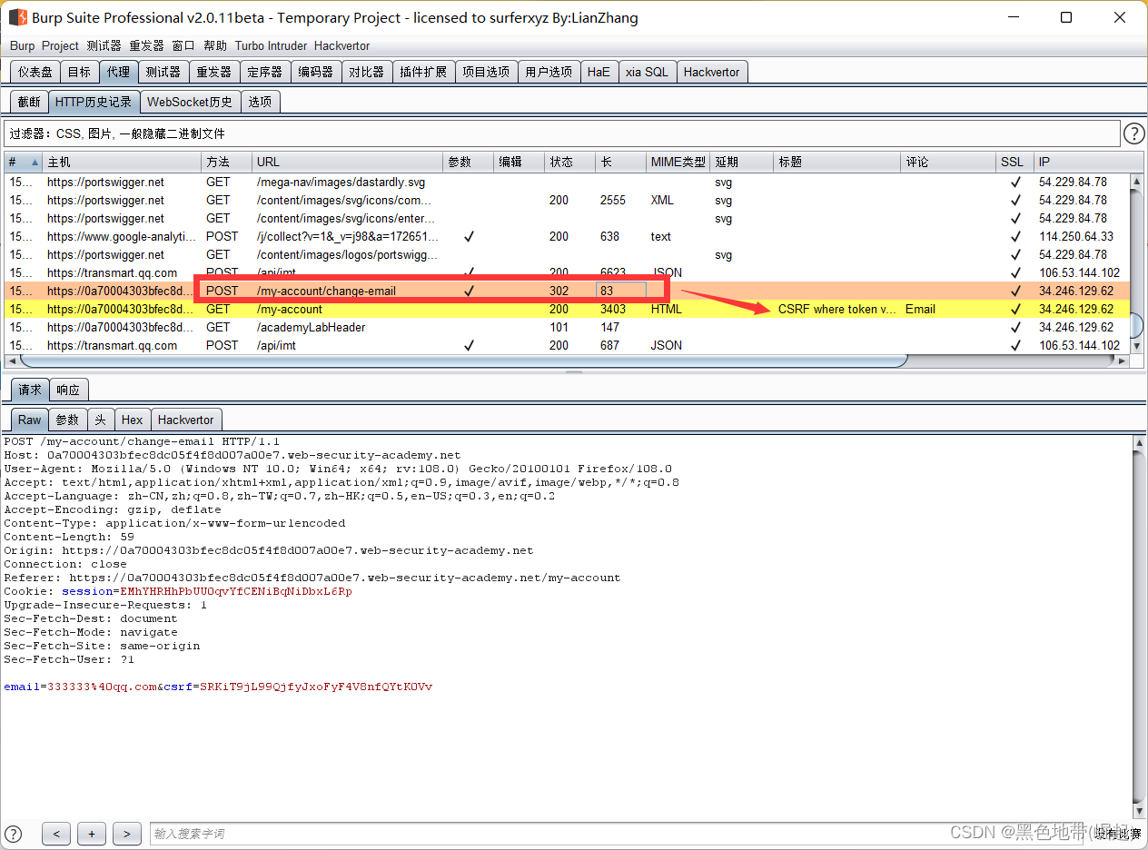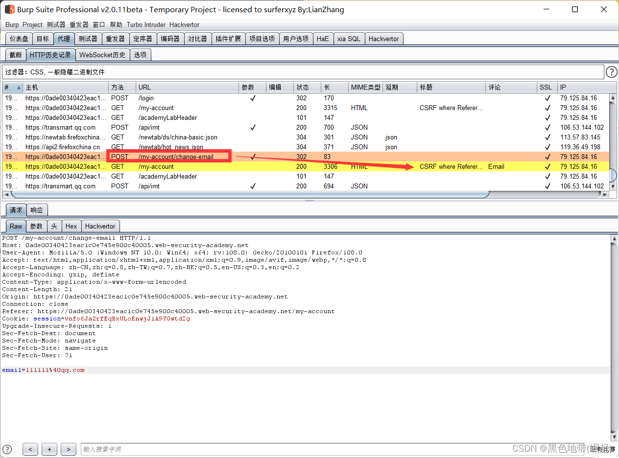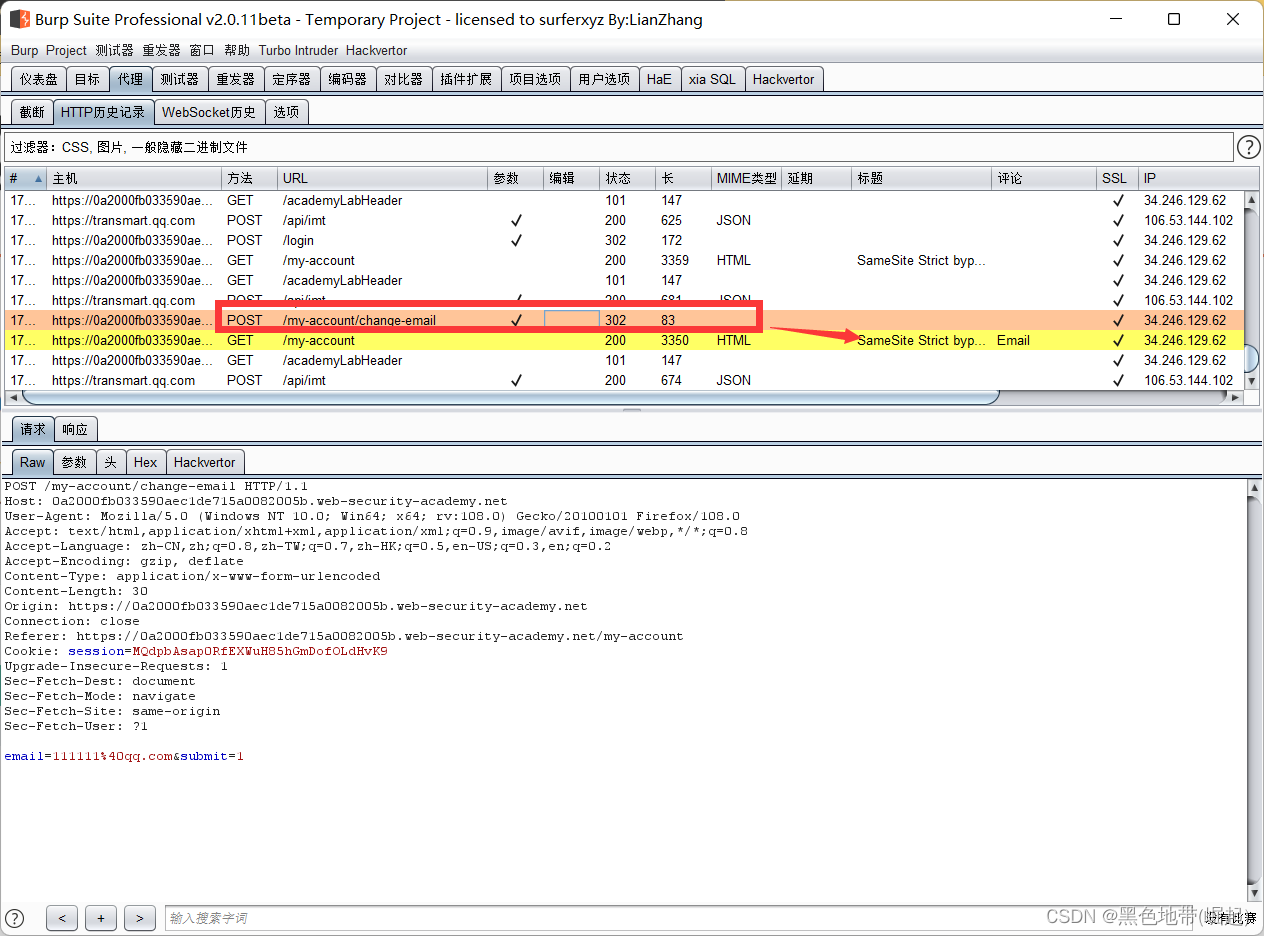 HTTP历史记录选项卡,找到POST /my-account/change-email请求,并确认会话cookie是否包含在内,即使这是一个跨站点POST请求